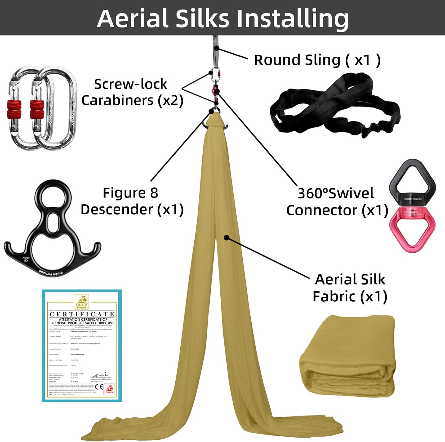 - 【Safety Tested & Guarantee】Aerial Silk is CE certified, SGS tested and recommended by certified aerial yoga teachers, Figure 8 Descender rated up to 32KN (7190pounds), 360°Swivel Connector (EN Certified) rated up to 30KN(6750 pounds), Round Sling Spanset rated up to 10KN(2248 pounds),Screw-lock Carabiners (CE & EN Certified) rated up to 25KN(5620 pounds)