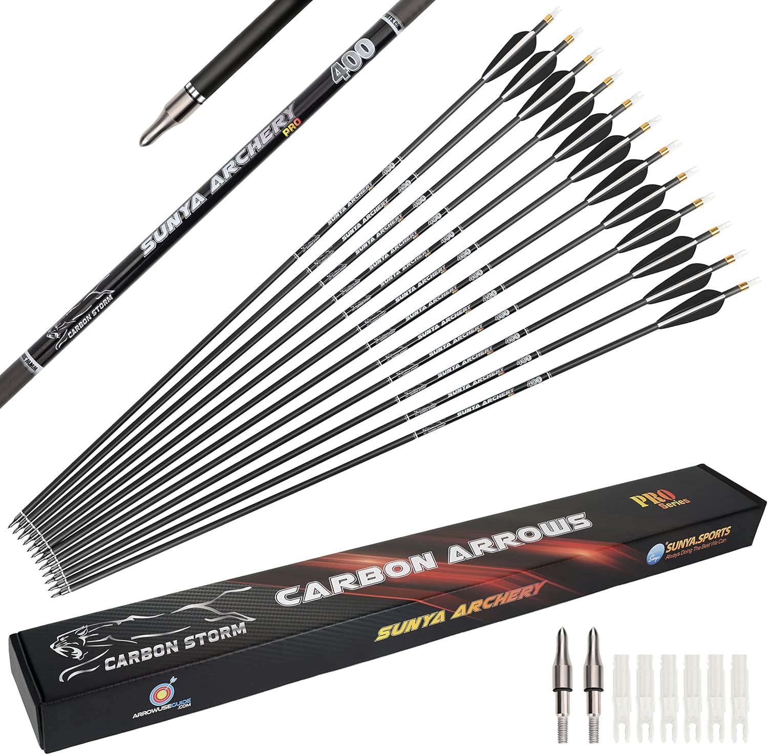 SUNYA 12-Pack 30 Inch Carbon Arrows Spine 500 or 400 for 40-60 LBS Bows|Switch to Recurve/Compound Modes, Anti-Loose O-Ring & TPU Vanes for Hunting/Target Practice