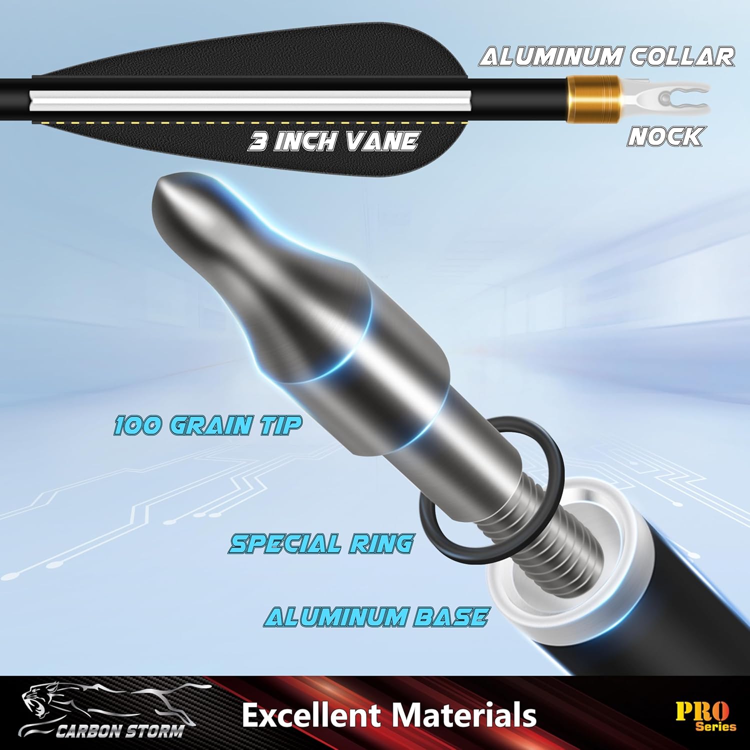 - Excellent Materials: Precision carbon shaft arrows. The removable stainless steel point is very sturdy. Comes with the most common 100-grain arrow tip which is tightened enough and could be replaced by other types easily.