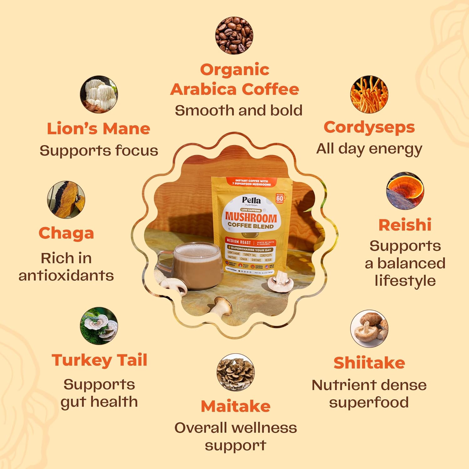 - Enhanced Mushroom Blend: Re-formulated mushroom coffee blend; includes 7 superfood mushrooms Lion's Mane, Reishi, Chaga, Cordyceps, Shiitake, Maitake, and Turkey Tail; offers a richer, smoother taste with greater health benefits