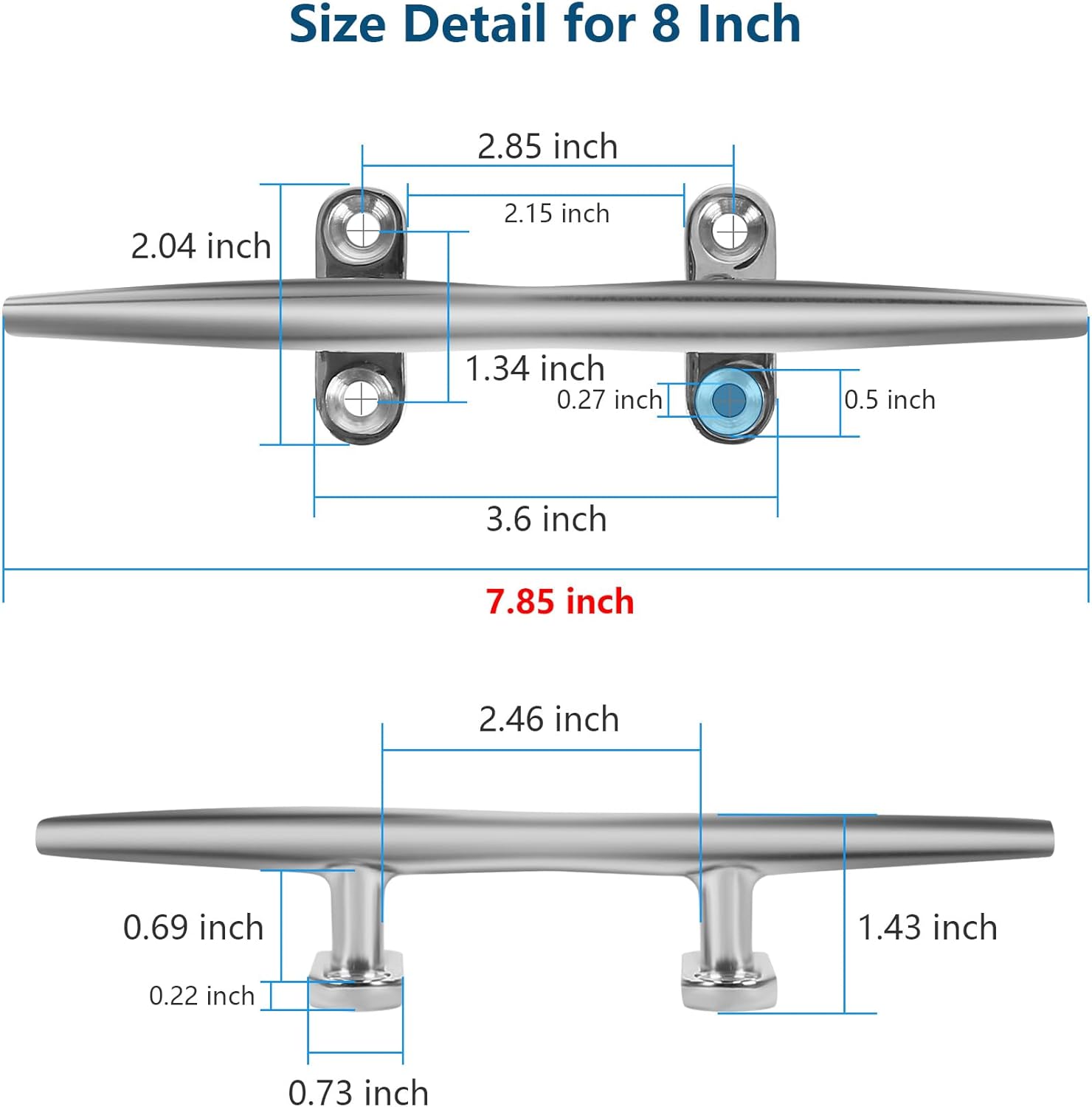 - 【MULTIPLE SIZE OPTIONS】: These boat cleats are easy to install, with four holes for connection, it has enough space to securely tie common knots, such as cleat knots, lilac knots, bowling ball knots and anchors Knots and more, open base, easy lanyard for any boat, we have different sizes and quantities for you to choose from: boat cleats 6 inch, boat cleats 8 inch, boat cleats 10 inch