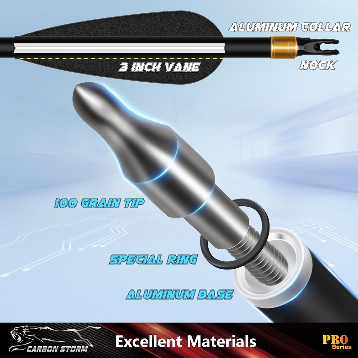 - Excellent Materials: Precision carbon shaft arrows. The removable stainless steel point is very sturdy. Comes with the most common 100-grain arrow tip which is tightened enough and could be replaced by other types easily.