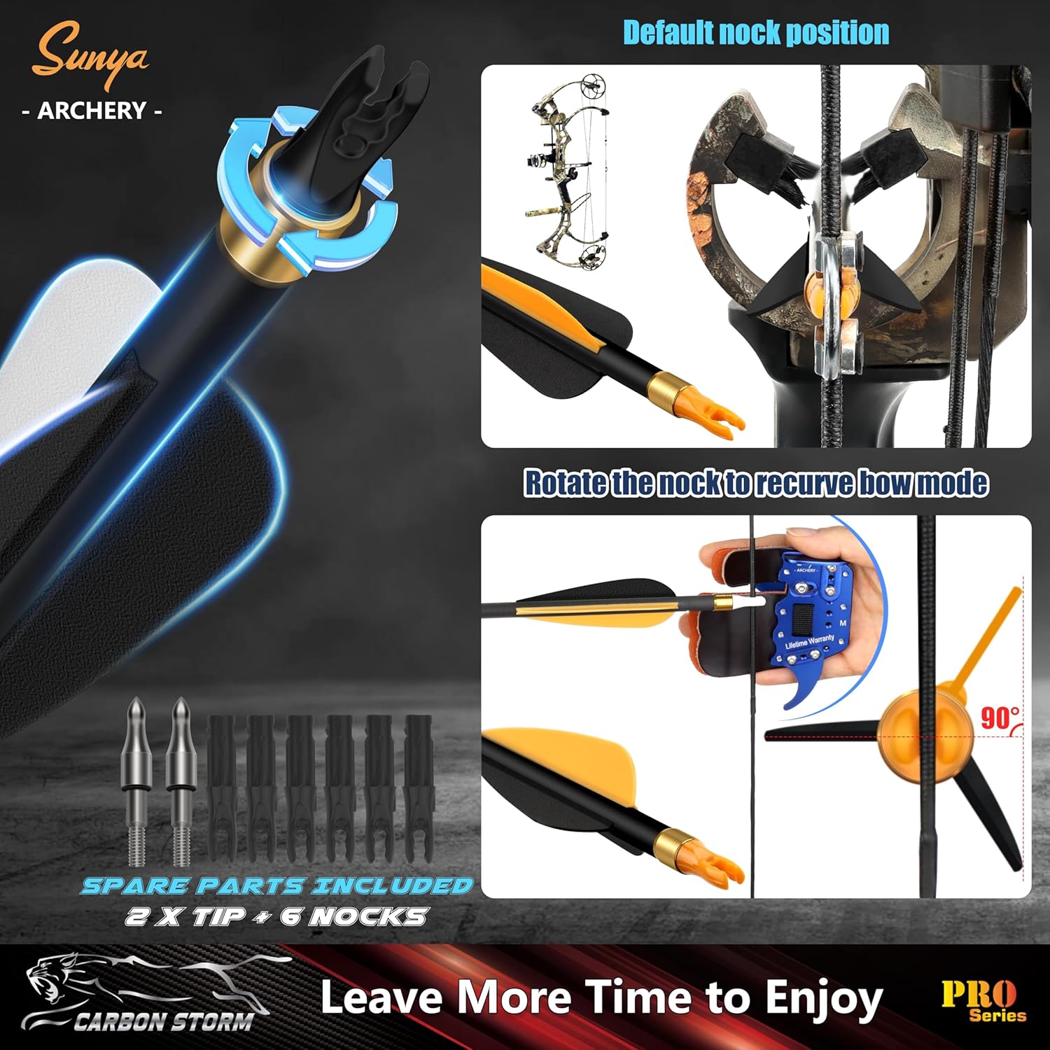 - Default compound bow style nock position. You can adjust the nock direction to fit for recurve bow and traditional bow.Color Box package with an arrow use guide on the back.