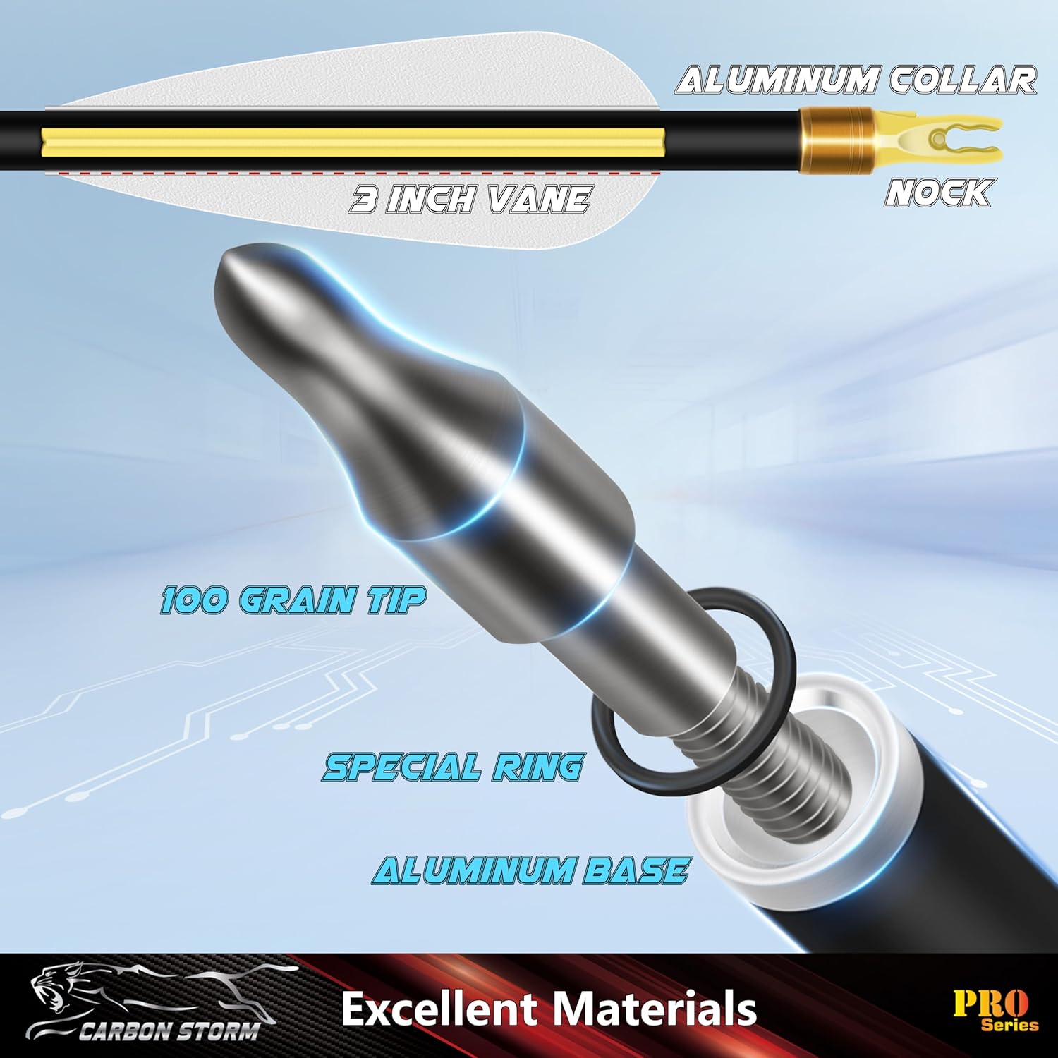 - Excellent Materials: Precision carbon shaft arrows. The removable stainless steel point is very sturdy. Comes with the most common 100-grain arrow tip which is tightened enough and could be replaced by other types easily.