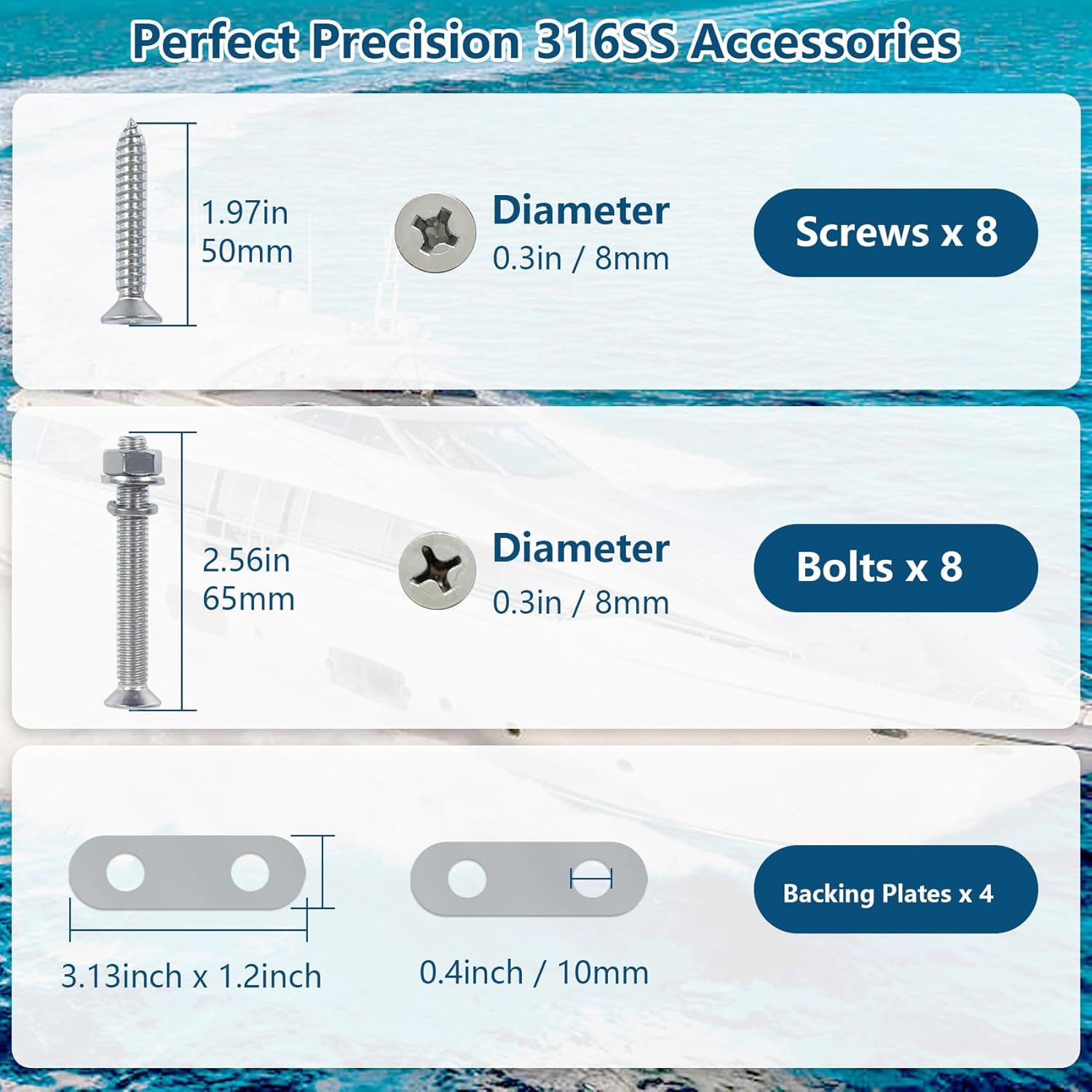 - 【BOAT CLEATS WITH BACK PLATE】: We provide two sets of boat cleat screws for installation, each set has a corresponding size of 316 stainless steel 4 x self-tapping threads, 4 x boat cleat bolts and 2 x upgraded boat cleat with backing plate accessories, so that you can have boat dock cleat in various places effortless to use, especially in the great outdoors, sturdy and hard-wearing, it stands up to the harsh marine environment