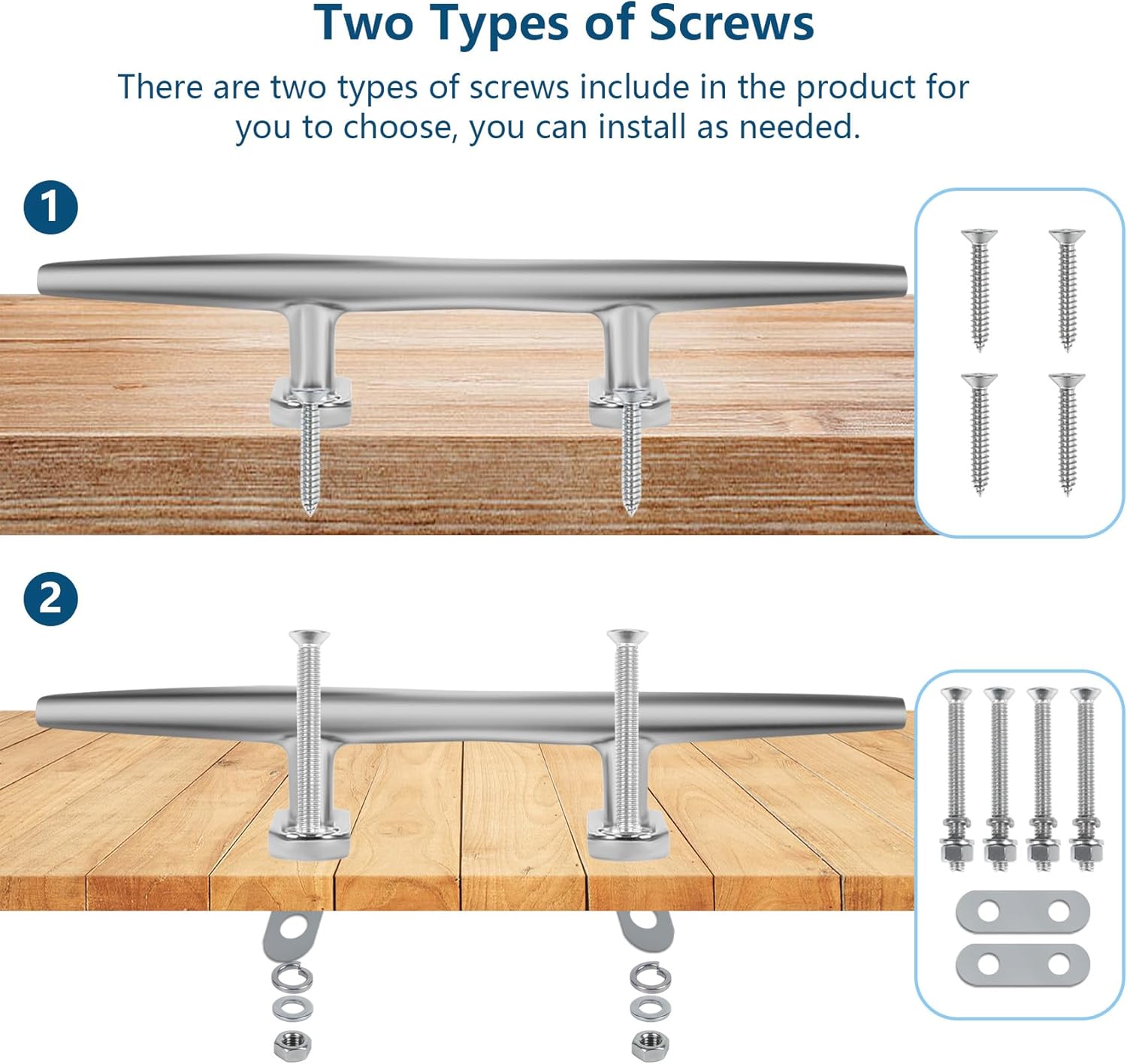 - 【BOAT CLEATS WITH BACK PLATE】: We provide two sets of boating accessories for installation, each set has a corresponding size of 316 stainless steel 4 x self-tapping threads, 4 x boat cleat bolts and 2 x upgraded boat cleat with backing plate accessories, so that you can have boat dock cleat in various places effortless to use, especially in the great outdoors, sturdy and hard-wearing, it stands up to the harsh marine environment