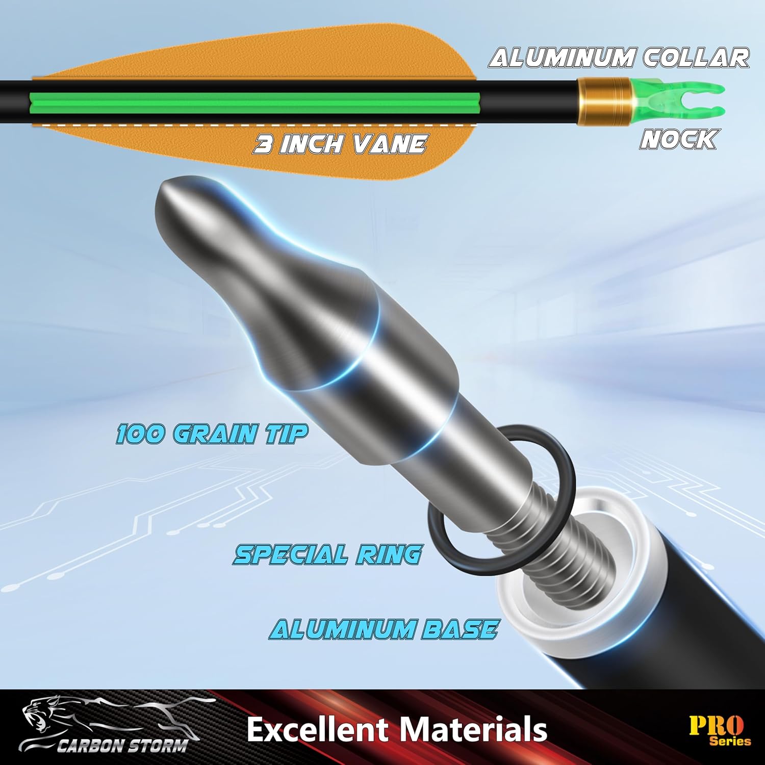 • Excellent Materials: Precision carbon shaft arrows. The removable stainless steel point is very sturdy. Comes with the most common 100-grain arrow tip which is tightened enough and could be replaced by other types easily.
