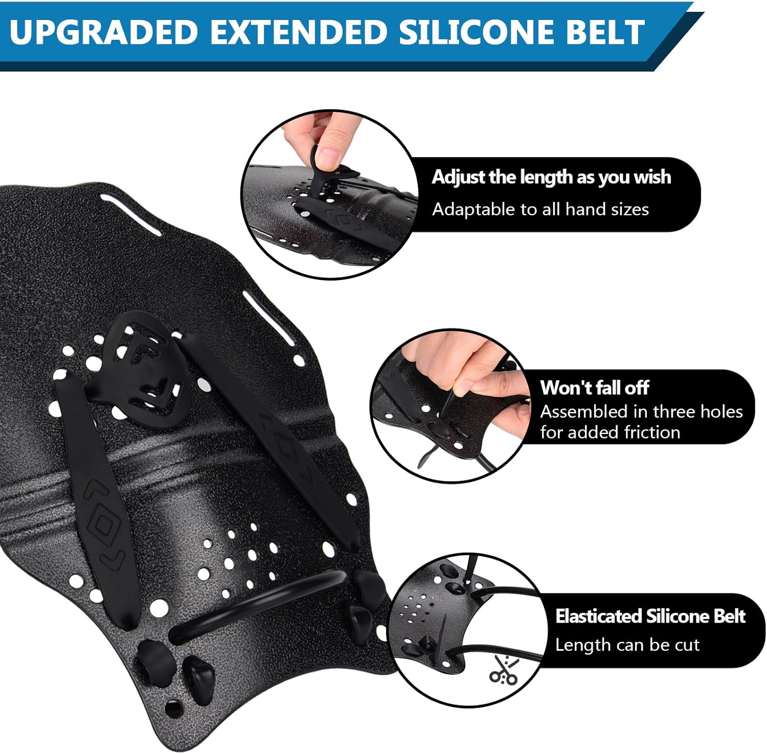 - [OPTIMISED AND IMPROVED] The updated design of the swim paddle hand have been lengthened and we are giving away 2 pairs of long and short wrist straps for you to choose from, eliminating the problem of the wrist straps falling off during swimming and greatly increasing the resistance of swimming.