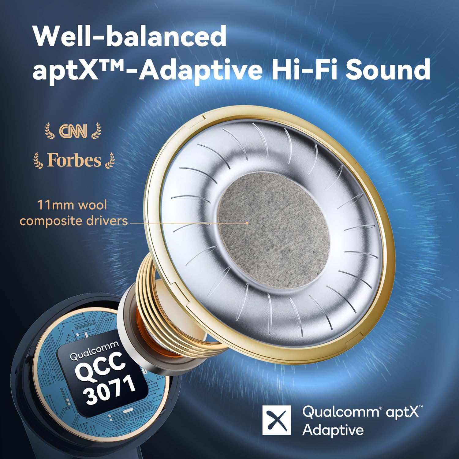 - Latest Qualcomm QCC3071 SoC & aptX Adaptive Audio. Powered by the advanced QCC3071 chipset and Qualcomm aptX Adaptive Audio technology, the TWS earbuds deliver powerful sound and incredible range while minimizing distortion. The EarFun Air Pro 3 earbuds are driven by premium 11mm wool composite dynamic drivers that deliver deep, moving bass, clear mids, and crisp highs.