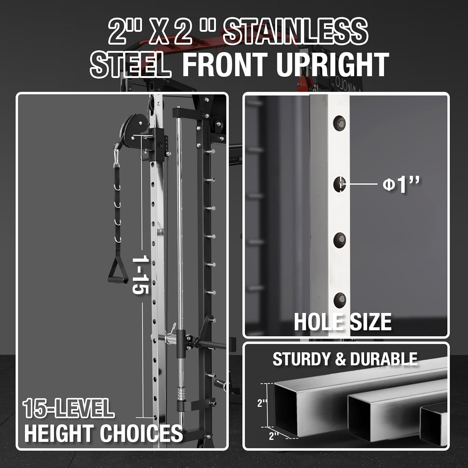 - [Build Your Dream Home Gym] One machine can meet your various needs. M4 is designed for trainers. It is combines power cage, smith machine, cable crossover machine, cable station, and pull-up station. Lets you do unlimited exercises in a limited space! Pre-reserved holes for resistance band, you can do more weight training and resistance exercise. Such as resistance (pull-ups, barbell squats, shoulder presses, cable chest fly, etc.)