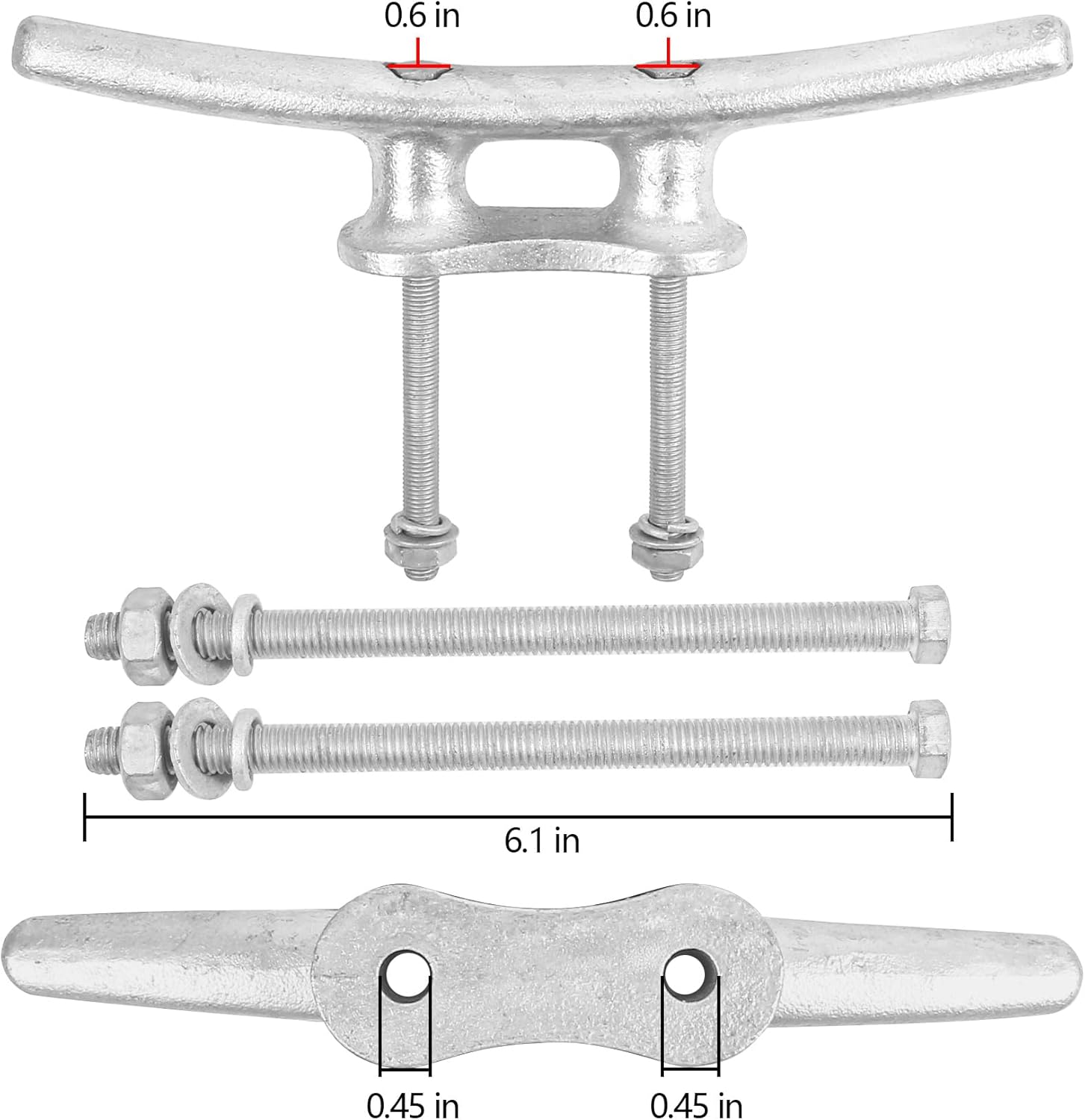 - 【Cleat Size & Bolts】These galvanized boat cleats have a size of 10 inches in length and 2.6 inches in height, with a base measuring 4 inches x 1.6 inches. The mounting holes are spaced 2.5 inches center to center. The dock cleats 10 inch with hardware, including M10x6 inch (152mm) bolts and nuts. The cleats for boat dock are designed to be a perfect size to fit any use, and if needed, the bolts can be cut to the desired length