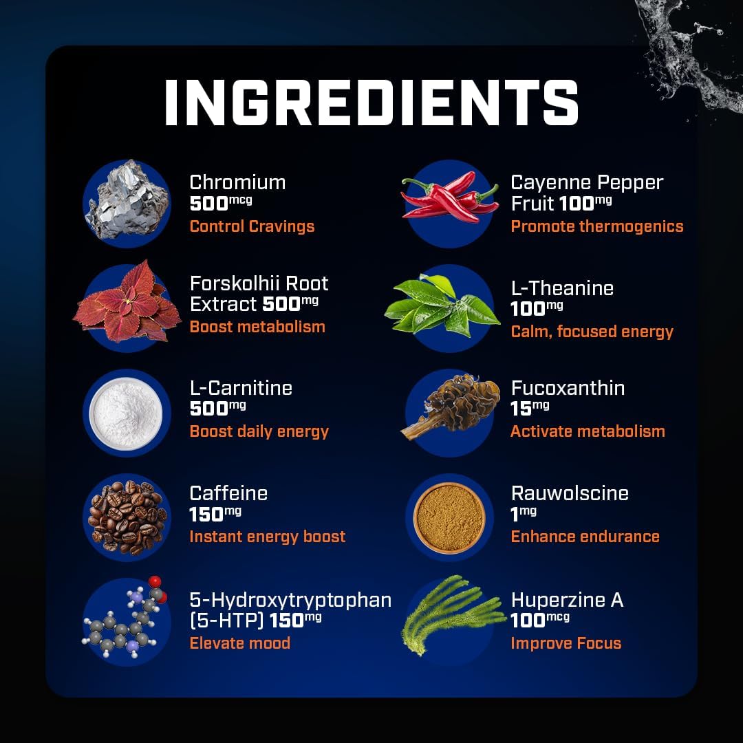 - ELITE THERMOGENIC STACK: Our potent thermogenic supplement combines L-Carnitine Supplement, Rauwolscine, 5-HTP, Cayenne Pepper, Forskolin Extract, Caffeine, Fucoxanthin, and other premium ingredients at clinically backed doses for maximum effectiveness.