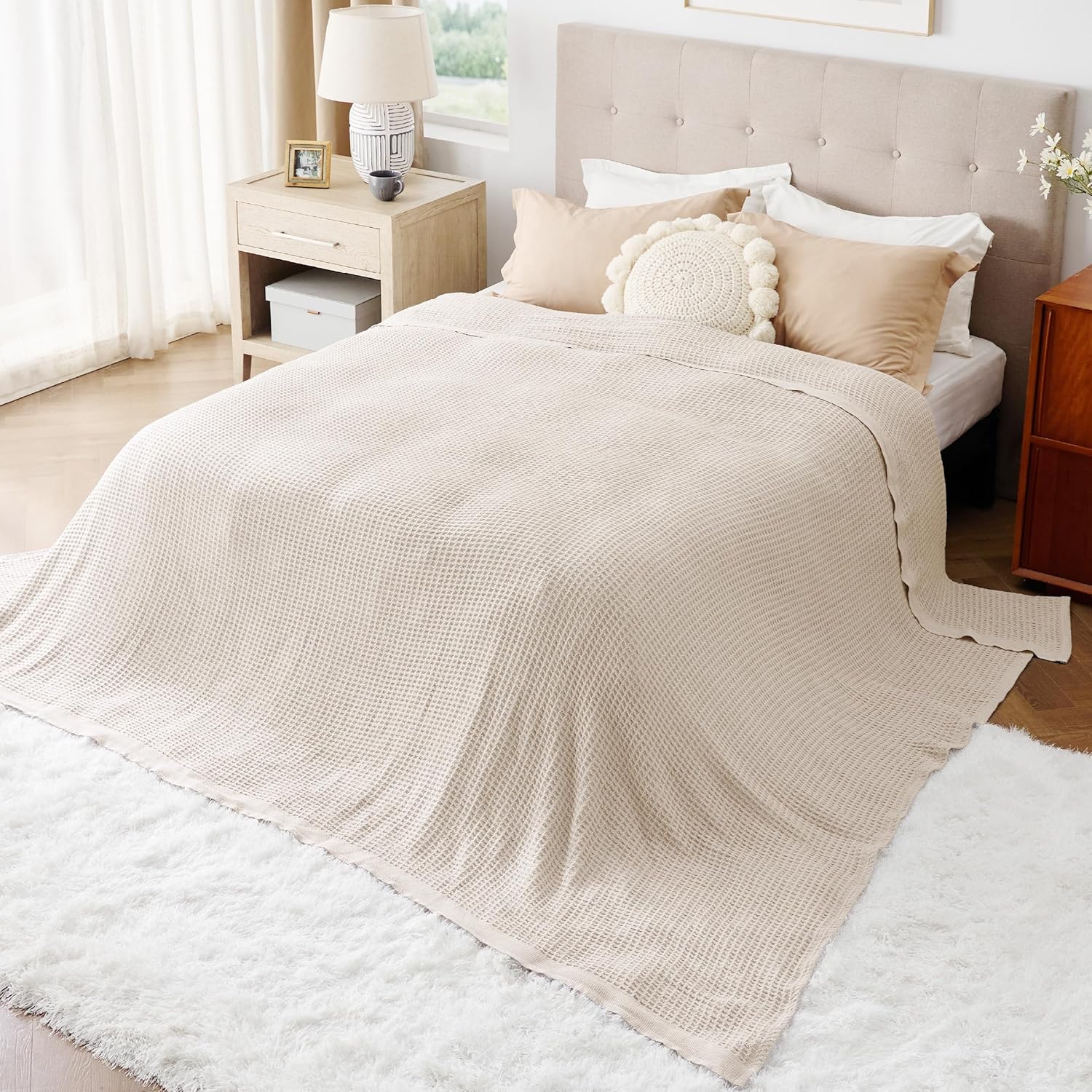 Bedsure 100% Cotton Large Blanket Oversized King for Bed - Breathable Thick Waffle Weave Blanket for Summer, Couch Cover, Khaki (a Little Bit Yellow), 120x94 inches