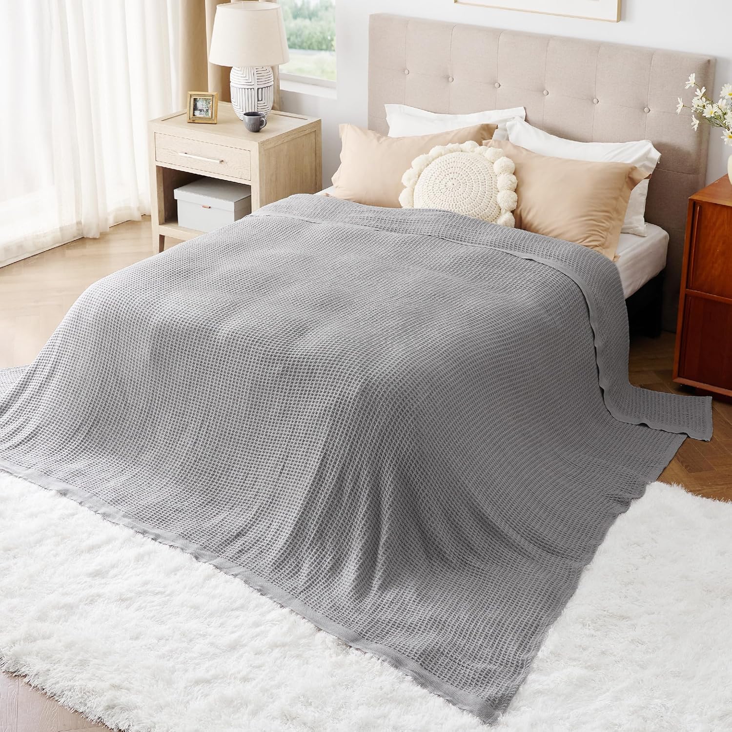 Bedsure 100% Cotton Large Blanket Oversized King for Bed - Breathable Thick Waffle Weave Blanket for Summer, Couch Cover, Grey, 120x94 inches