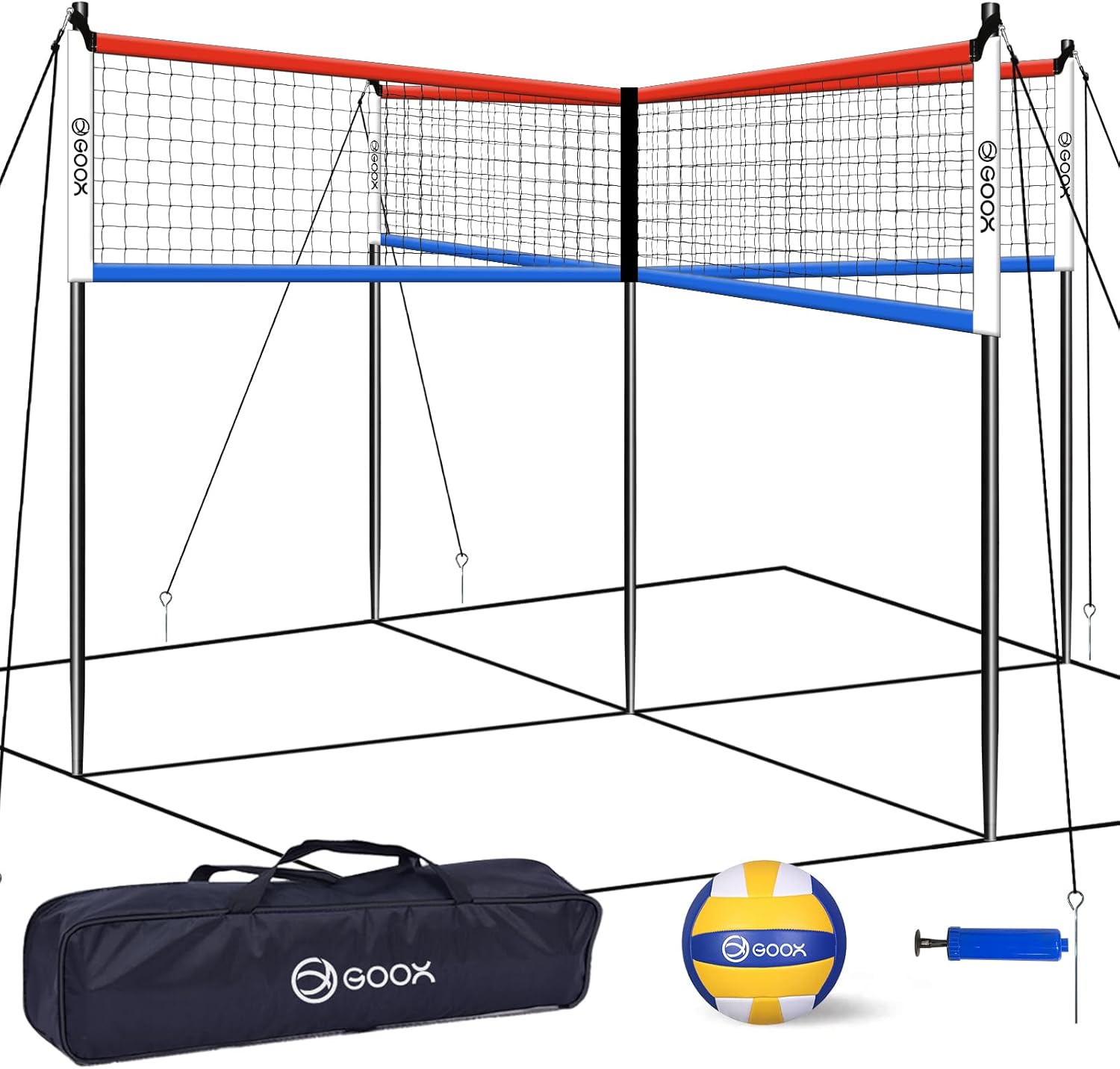 GOOX 4 Square Volleyball Net Game Set, 14 FT 4-Way Volleyball Net for Backyard Beach Lawn, Portable Four Square Volleyball Net for Adults & Youths with Vollyball, Pump, Carry Bag