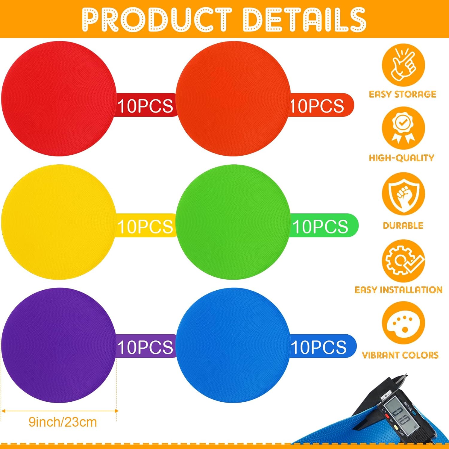 - Easy to Spot: with 6 vibrant colors, including red, orange, yellow, green, blue and purple, these floor markers for classroom are suitable for schools, recreation centers, agility courses, group exercises, or gym classes; Floor spots allow you to quickly spot what you need without any confusion or hassle