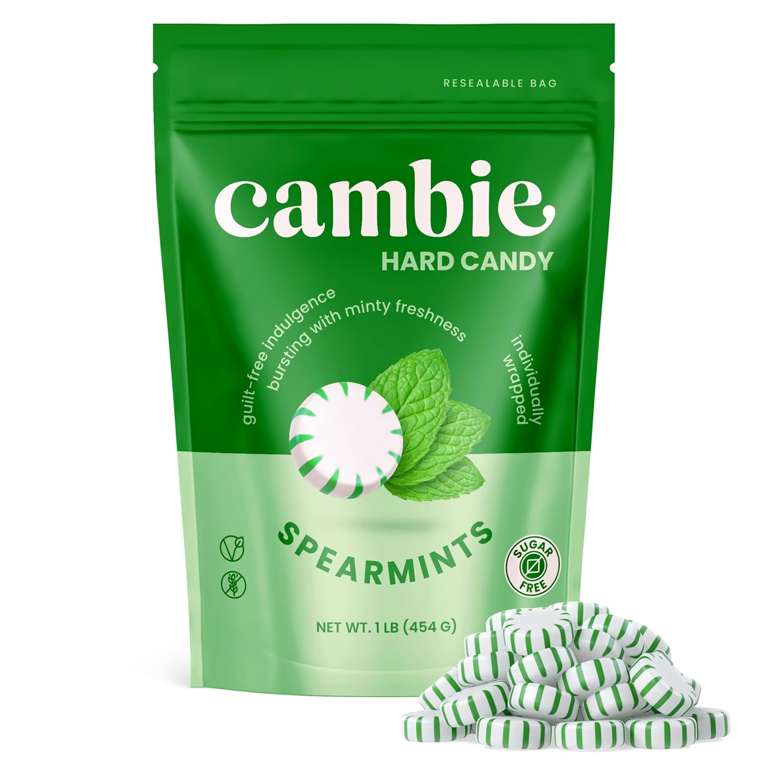 Cambie Sugar Free Mints, 1 lb of Sugar Free Hard Candy, Spearmints Individually Wrapped with a Refreshing & Sweet Spearmint Flavor, Packaged Fresh in a Resealable Pouch