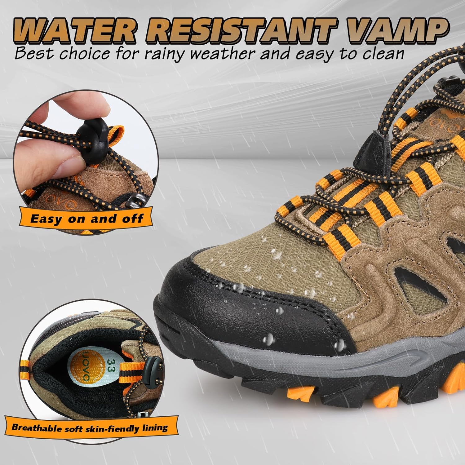 - WATER REPELLENT VAMP - Kids waterproof shoes made with anti water splashing fabric ,allows kids to play at will, not to go out because of the rain.