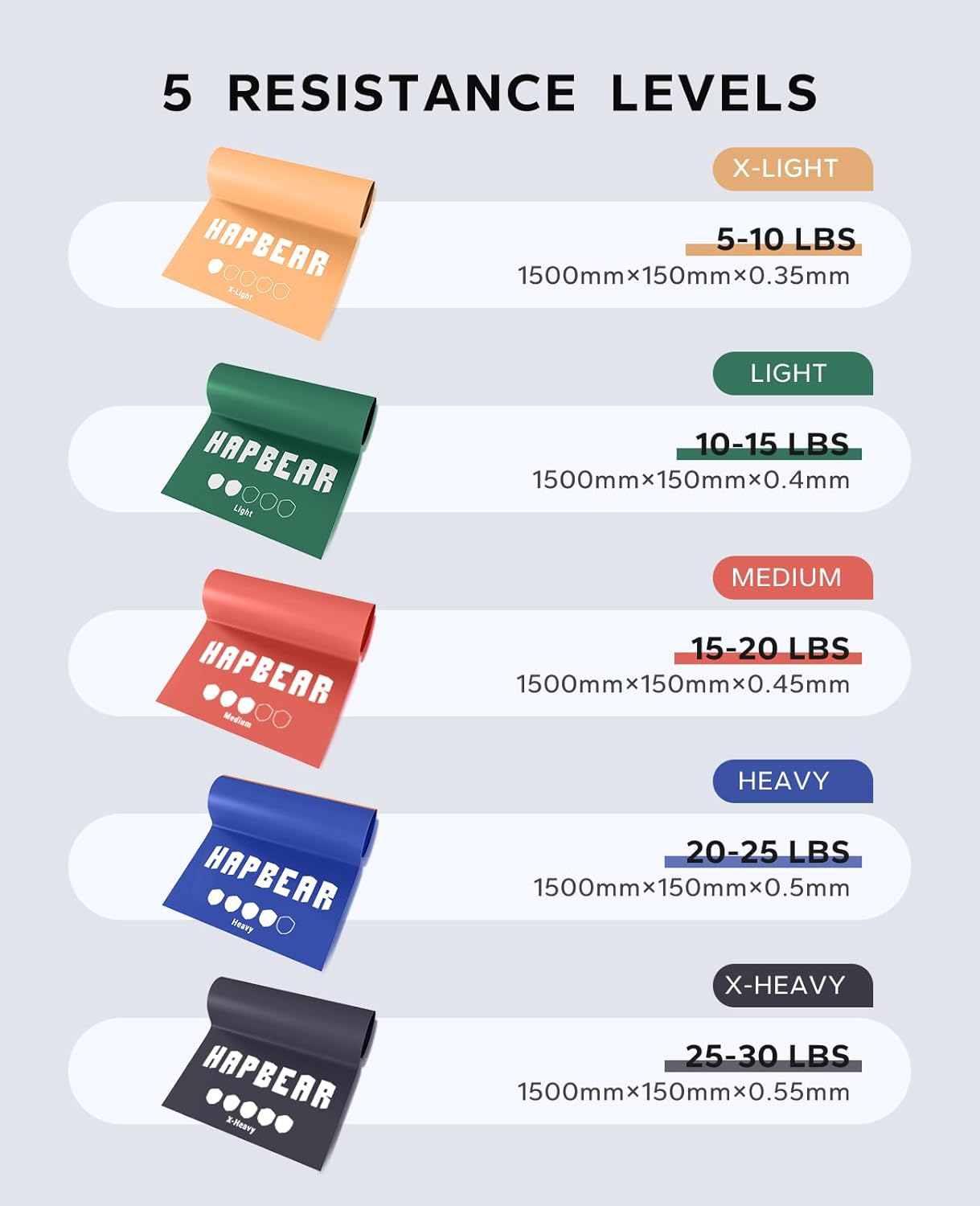 - 【What Will You Get】HAPBEAR long recovery band set of 5, 1x Storage Nylon Bag, 1x User Manual and high-quality after-sales service. Any problems or questions, contact us at any time. We will help you solve it ASAP. I believe that HAPBEAR Fitness will become your first choice for indoor exercising!