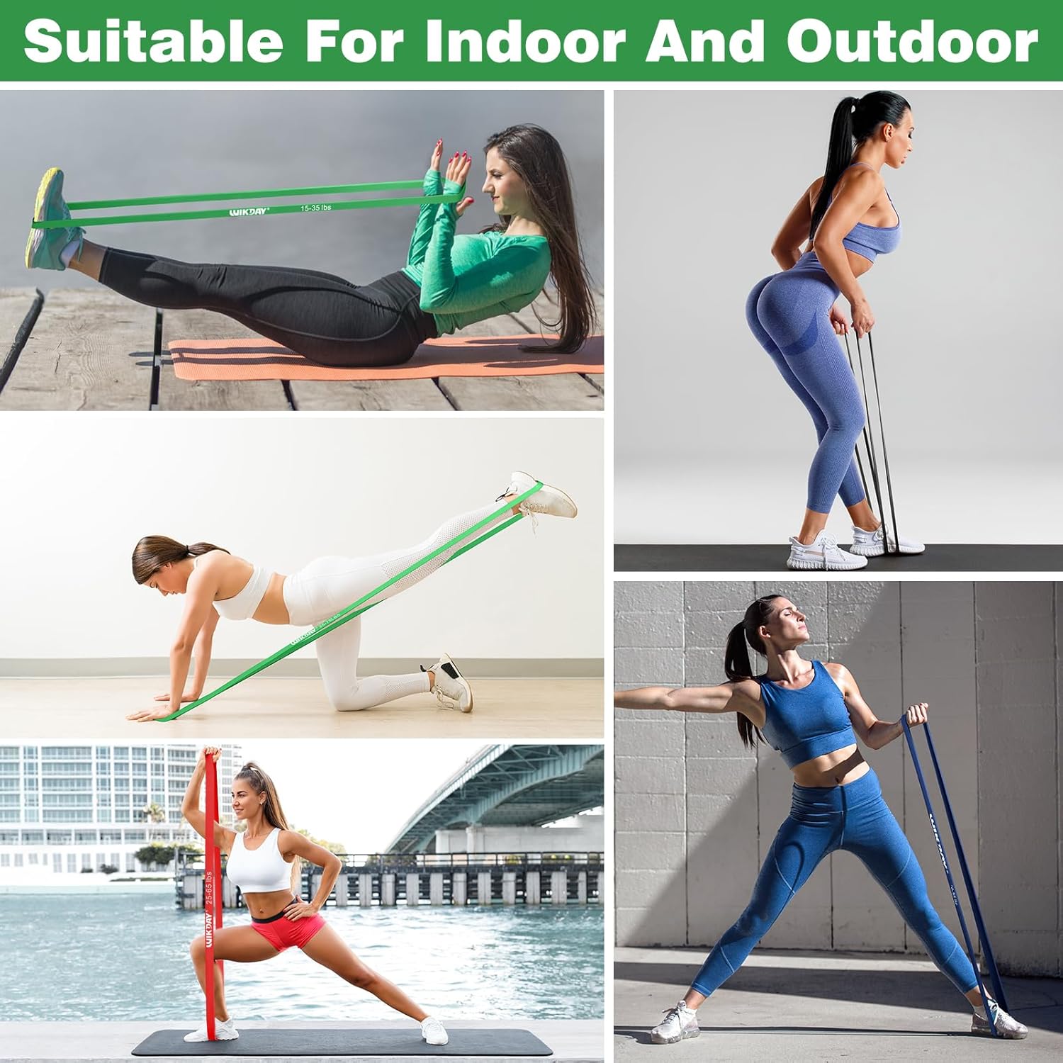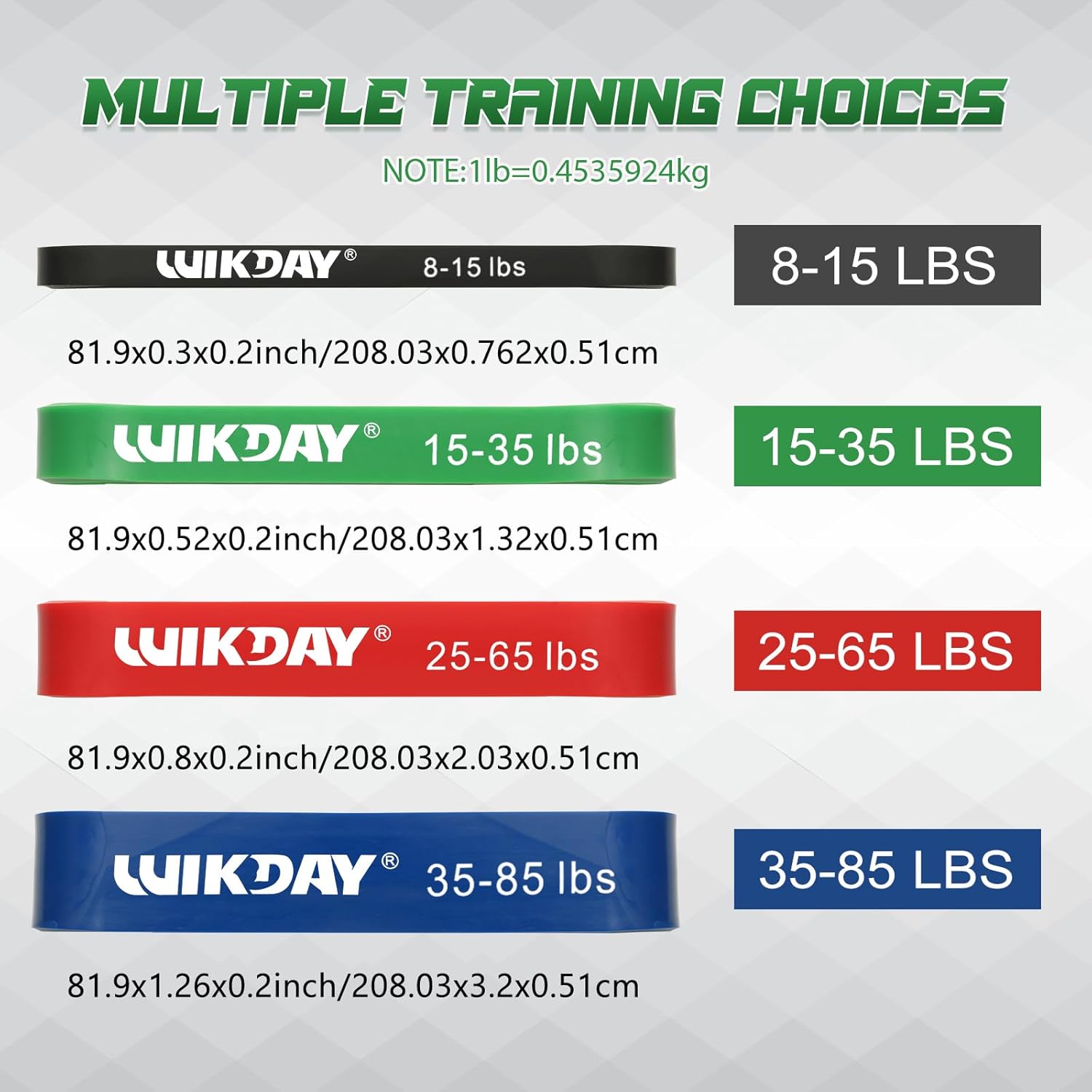 - Wide Applications: This professional exercise bands comes with 4 different levels of resistance. Black(8-15 lbs), Green(15-35 lbs), Red(25-65 lbs), Blue(35-85 lbs),. They are very suitable for beginners, fitness enthusiasts, athletes and other people