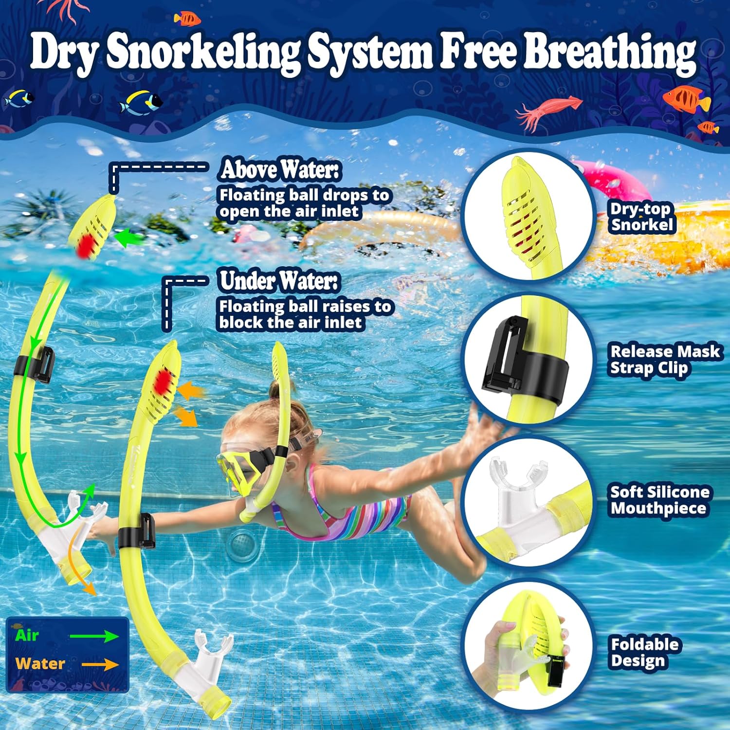 - 🌞【Anti-choking breather tube ensures smooth breathing】- The kids snorkel set prevents water ingress while diving with a dry valve design. The ball valve at the top, when the tube under water, the entrance of the tube will be closed by the floating ball to make sure anti splash. In addition, accumulated water can be easily blown out through the lower valve. It is easy and safe to use for kids, even for beginners.