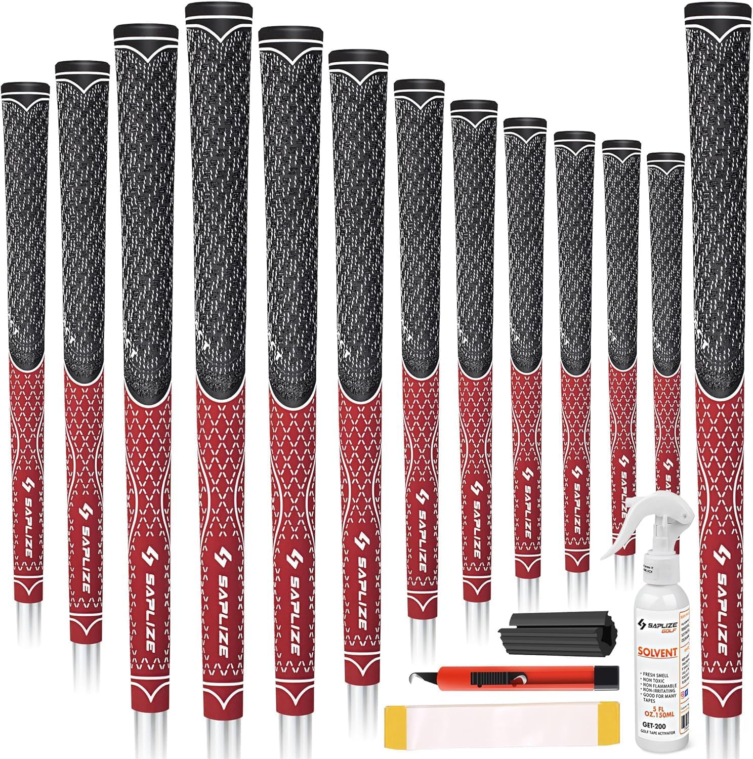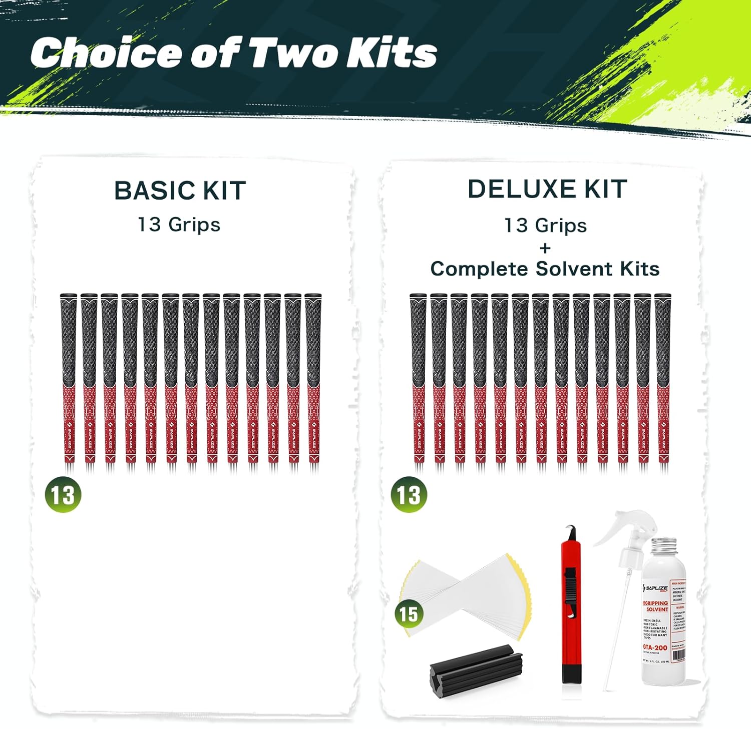 - Choice of Two Kits: Available in Deluxe (13 grips, 15 tapes, 5 oz solvent, rubber vise clamp, hook blade) and Basic (13 grips only) kits. Our 0.25 mm thick, high-stickiness golf grip tape works seamlessly with SAPLIZE solvent for easy installation of golf grips