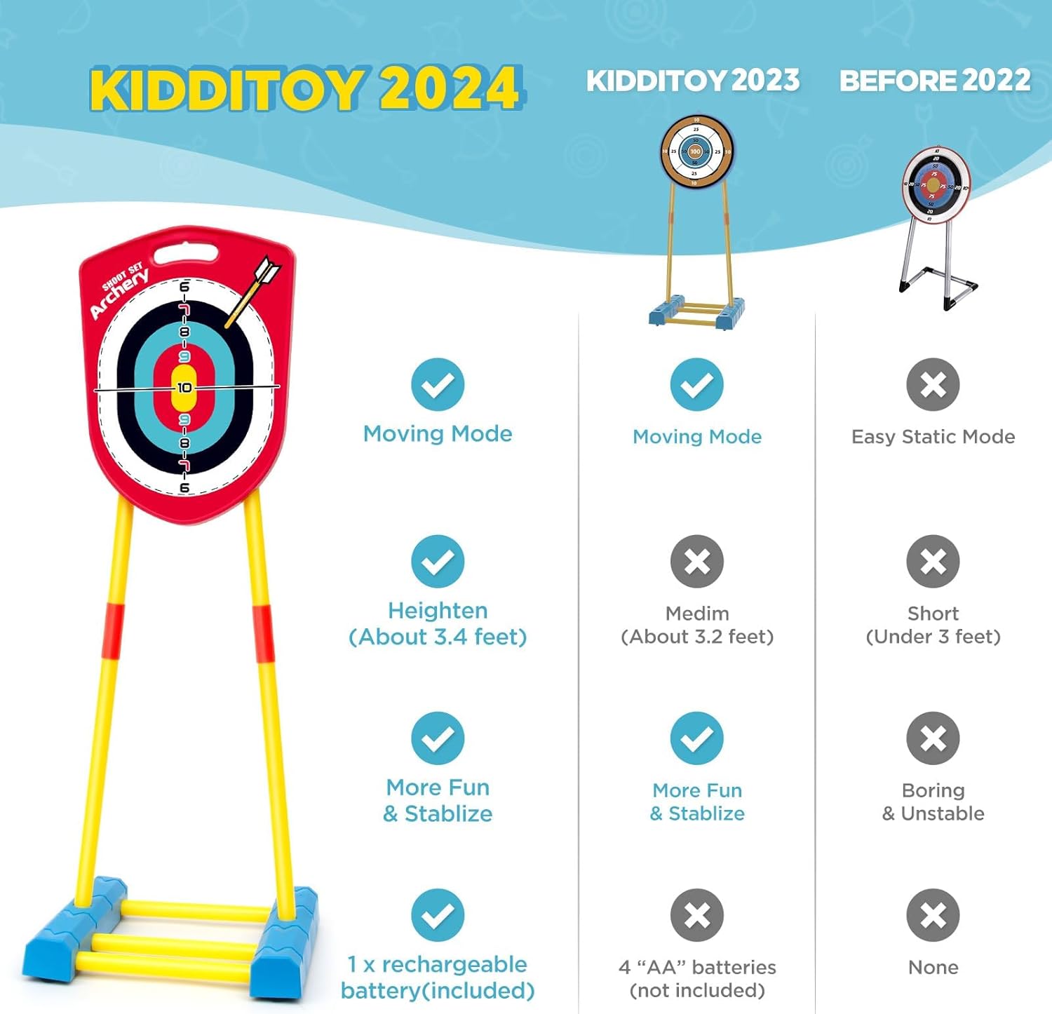 - Upgrade Kids Bow and Arrow Set: This fantastic archery set includes 2 bows, 20 large suction cup arrows, 1 standing stand(Includes rechargeable battery), 2-in-1 target, and 2 quivers. Our upgraded standing target can move left automatically and right, making the competition more challenging