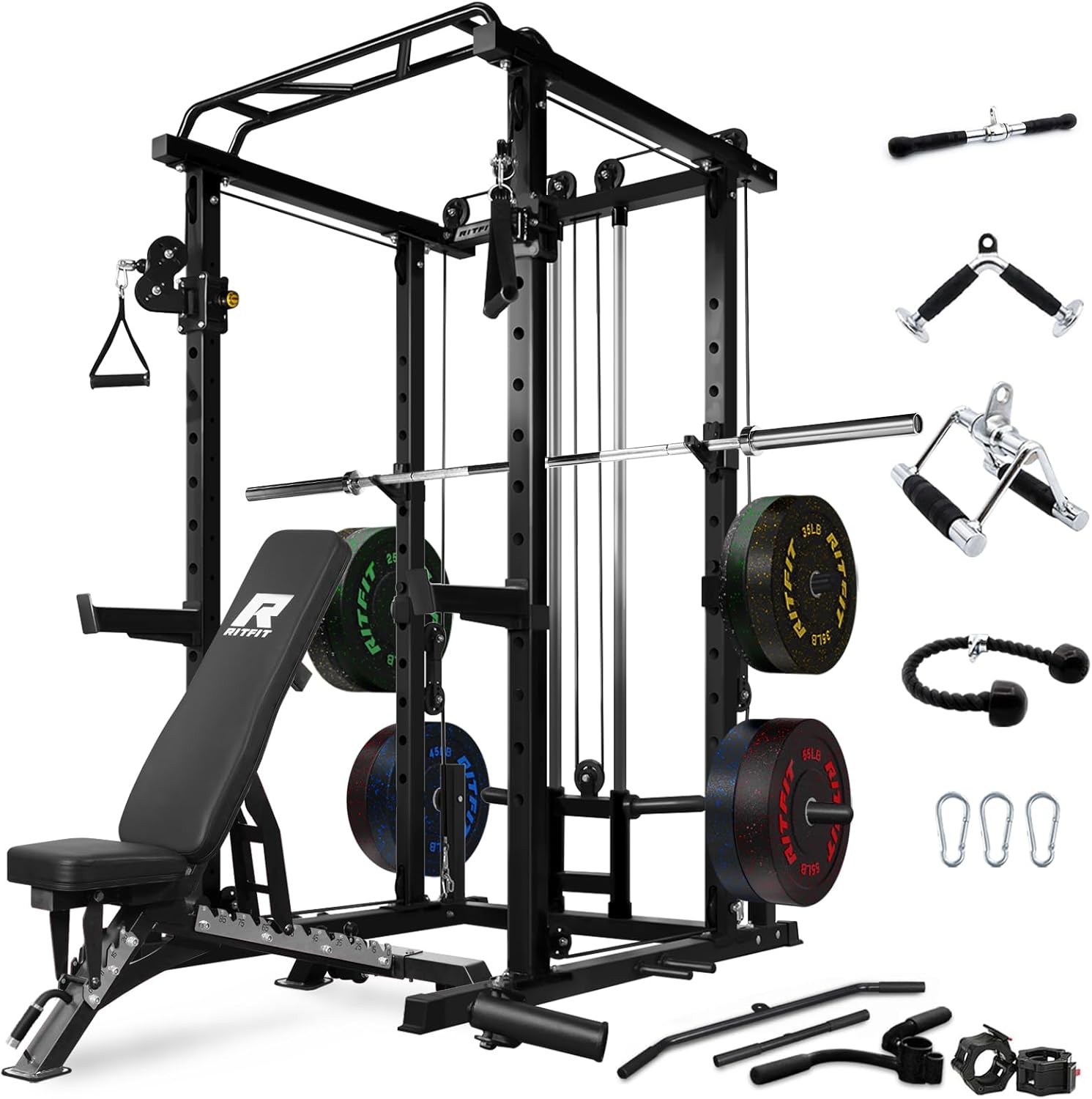 RitFit Power Cage with Optional LAT PullDown/Cable Crossover, 1000LB Squat Rack for Home & Garage Gym, with Weight Storage Rack and More Training Attachments, ASTM-Certified