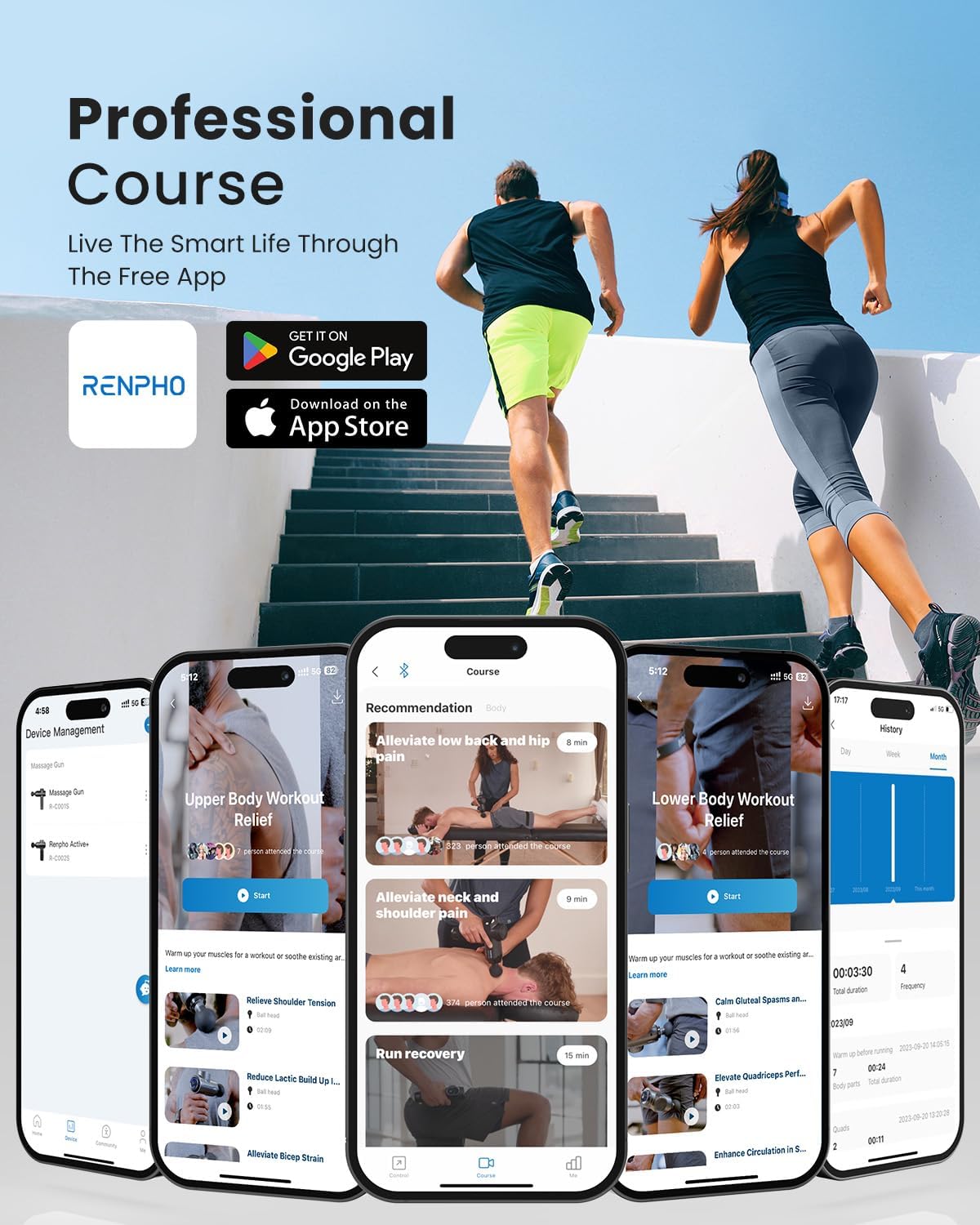 - Smart Massage Gun: Connect to the RENPHO Health App via bluetooth, you can control massagers' speed through the App. Professional video courses from the App provide a visual guide for specific muscle groups to warm up or post workout recovery