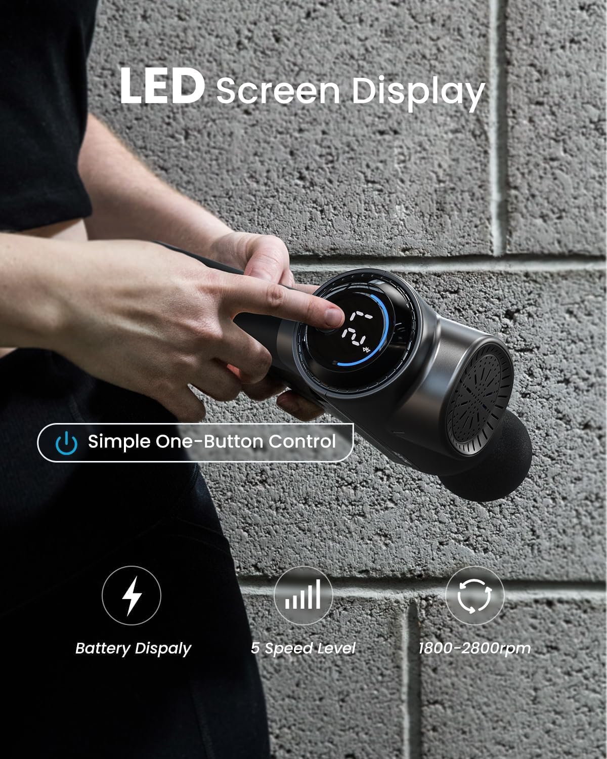 - LED Display: Simple one-button control 5 speeds from 1800 to 2800rpm. The LED screen displays the remaining battery percentage so that you can charge the percussion massage gun in time