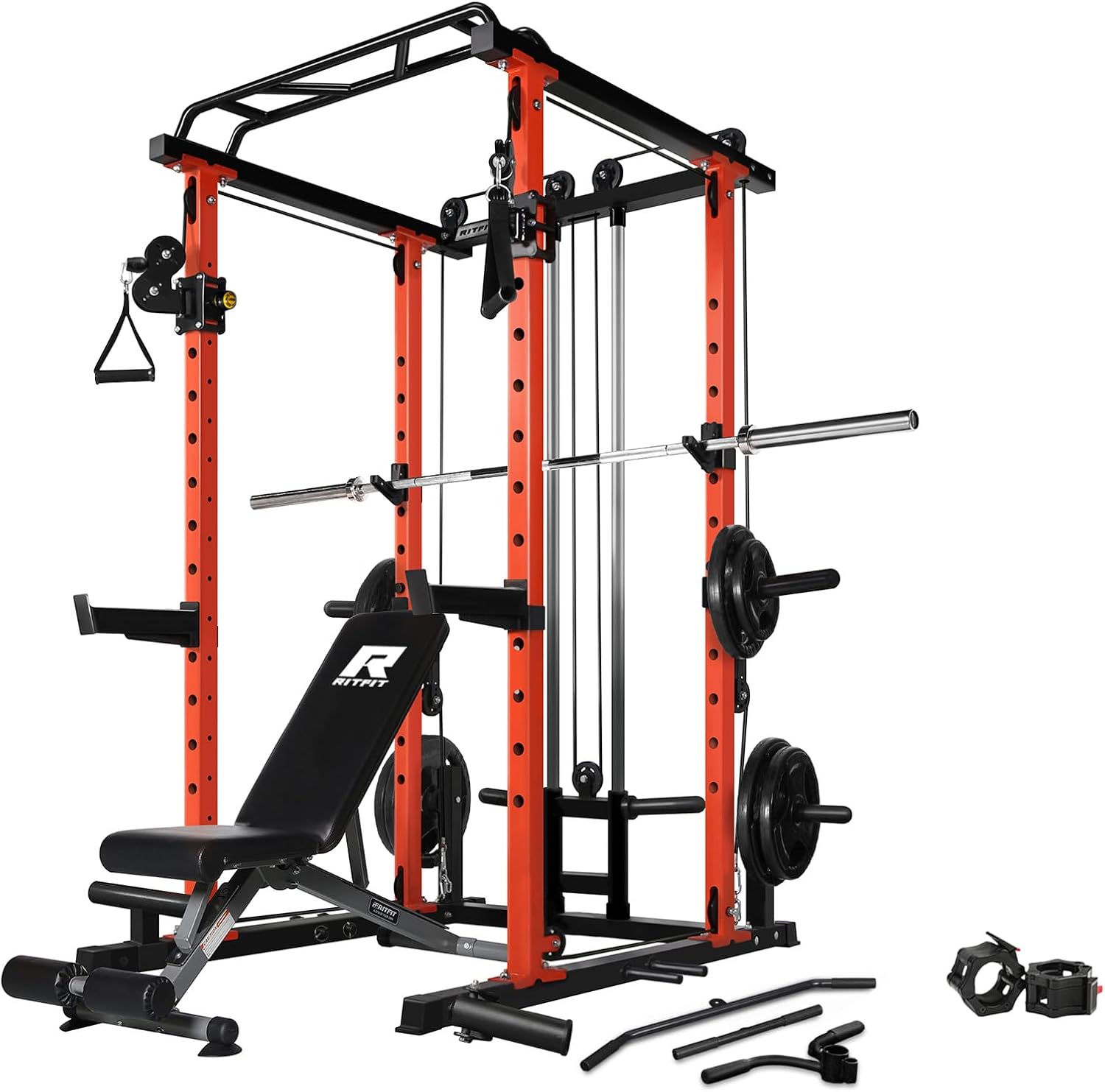 - What's in the package - RitFit PPC03(PC-410CC) Power Cage with Cable Crossover System *1; RitFit Adjustable Weight Bench *1; RitFit 2 inch Olympic Barbell *1; RitFit 230LBS Olympic Rubber Plates Set (10lbs *2, 25lbs *2, 35lbs *2, 45lbs *2); Free Collars *2