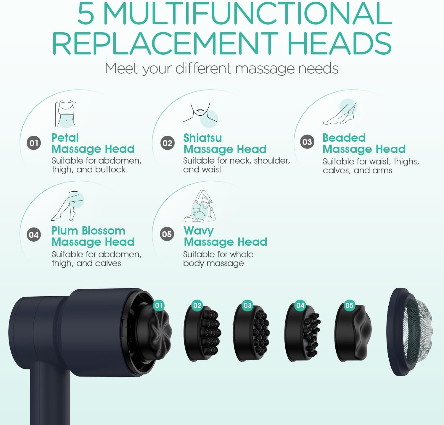- 5 Multifunctional Heads - Equipped with 5 replaceable heads of different shapes, this electric handheld massager can meet the dual requirements for cellulite removal and body relaxation, as well as the massage of different body parts. You can select different heads according to actual needs.