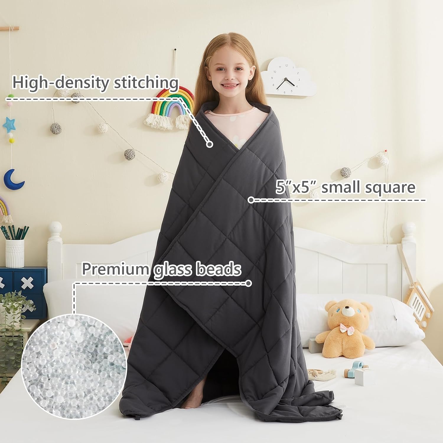 - Precise Positioning Technology: The biggest problem of weighted blanket is that as the beads move that the weight becomes uneven. To solve this problem, we use a professional tool and high-strength sewing thread to ensure that the beads evenly distributed