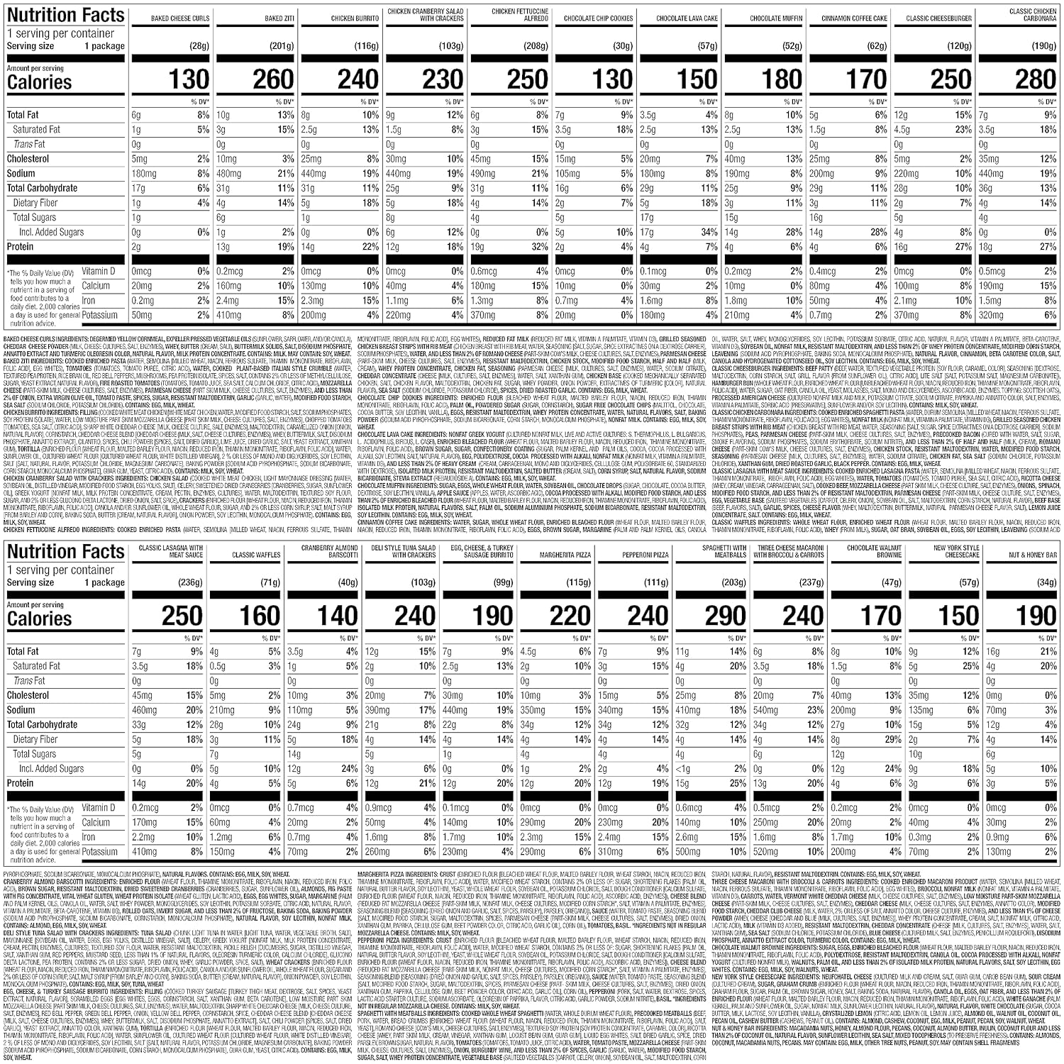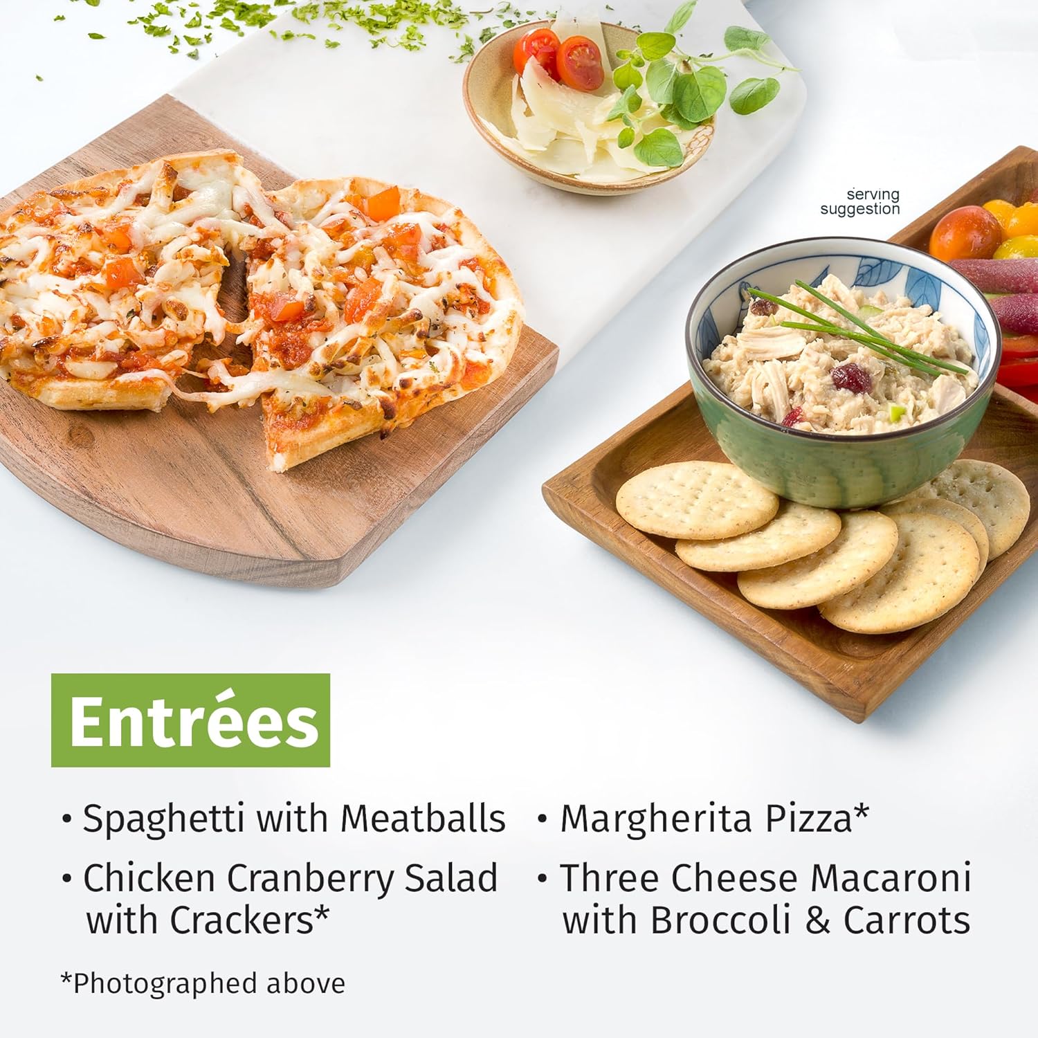 - ENTRÉE MENU - Prepared lunches & dinners include: Baked Ziti, Chicken Burrito, 2 Chicken Cranberry Salad with Crackers, Chicken Fettucine Alfredo, Classic Lasagna with Meat Sauce, 2 Deli Style Tuna Salad with Crackers, Margherita Pizza, Spaghetti with Meatballs, Pepperoni Pizza, Classic Chicken Carbonara, Three Cheese Macaroni with Broccoli & Carrots, Classic Cheeseburger