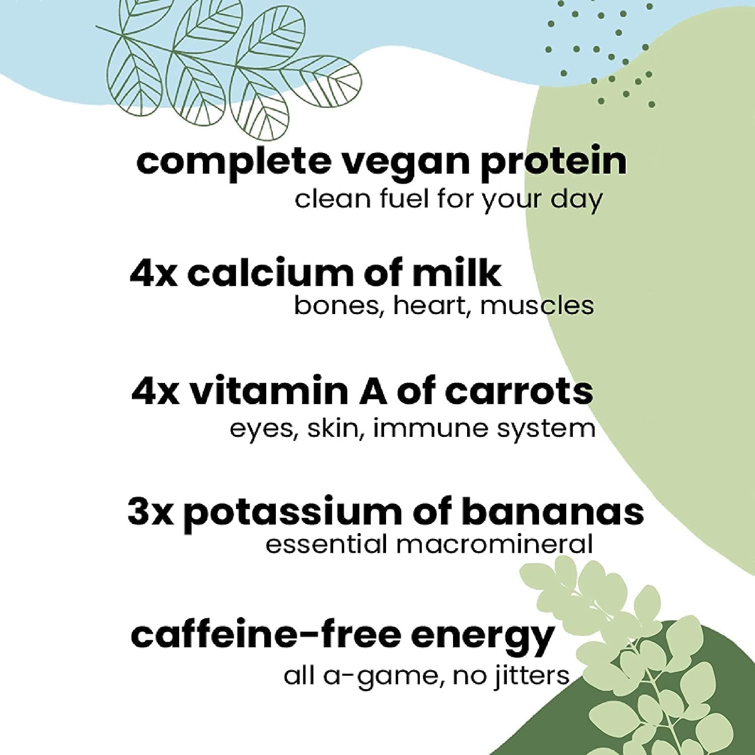 - 🌿Healthy and delicious! Start with one teaspoon of moringa powder per day. Mix in to smoothies, soups, acai bowls, and meals for a healthy burst of protein, vitamins, antioxidants, and iron