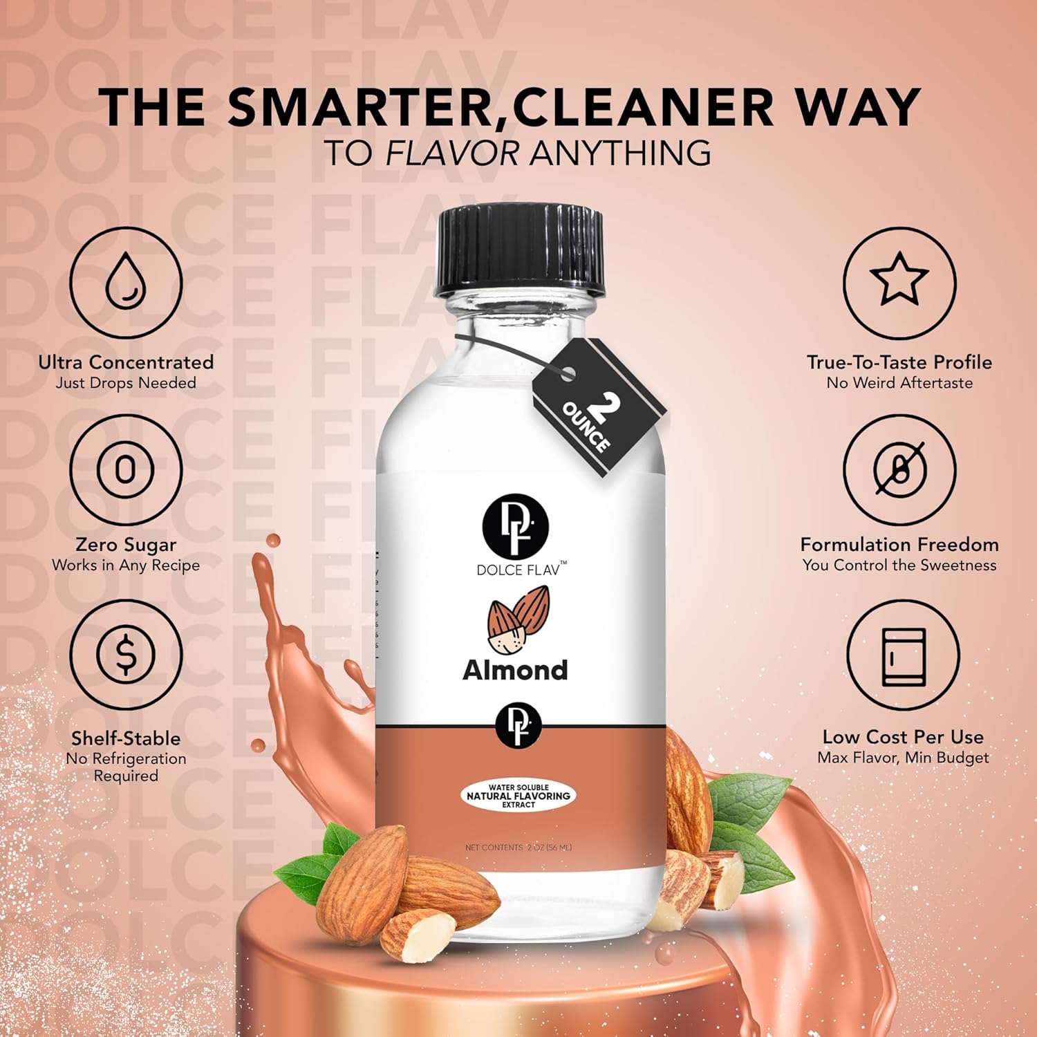 Dolce Flav Natural Almond Extract – 2 Ounce Water-Soluble Kosher, Sugar-Free, Concentrated Pure Almond Flavoring for Baking, Pastries & Beverages, Includes Measured Dropper