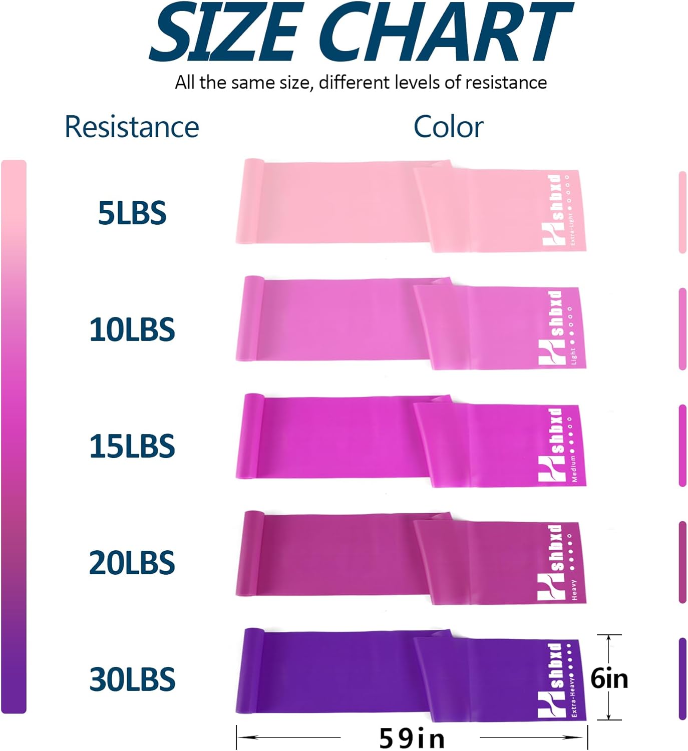 - 5 Levels Of Resistance - 5 resistance bands are 59in (150cm) long and 5.9in (15cm) wide, the resistance bands is yellow band (5 lbs), red band (10 lbs), green band (15 lbs), blue strap (20 lbs), gray strap (30 lbs).