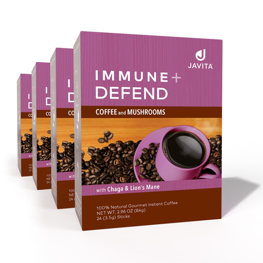 Mushroom Coffee by Javita, Immune & Defend Blend of Chaga, Lion's Mane and Dark Roast Coffee for Morning Boost, Antioxidant Support; Keto-friendly, 4 boxes of 24 (3.5g) Sticks, 96 ct
