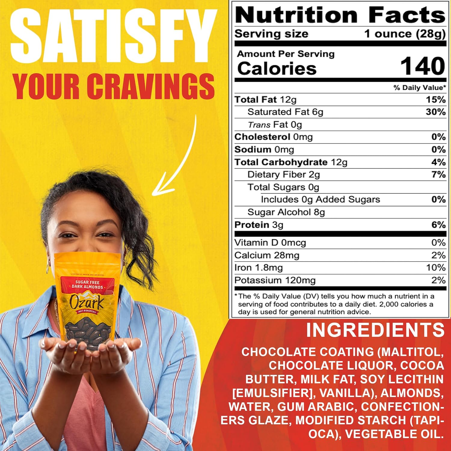 OZARK NUT ROASTERS, Sugar-Free Dark Almonds, Dark Chocolate Flavored Snacks, No Sugar Added, World-Class Gourmet Candied Nuts, Resealable Pack (14.0 oz)