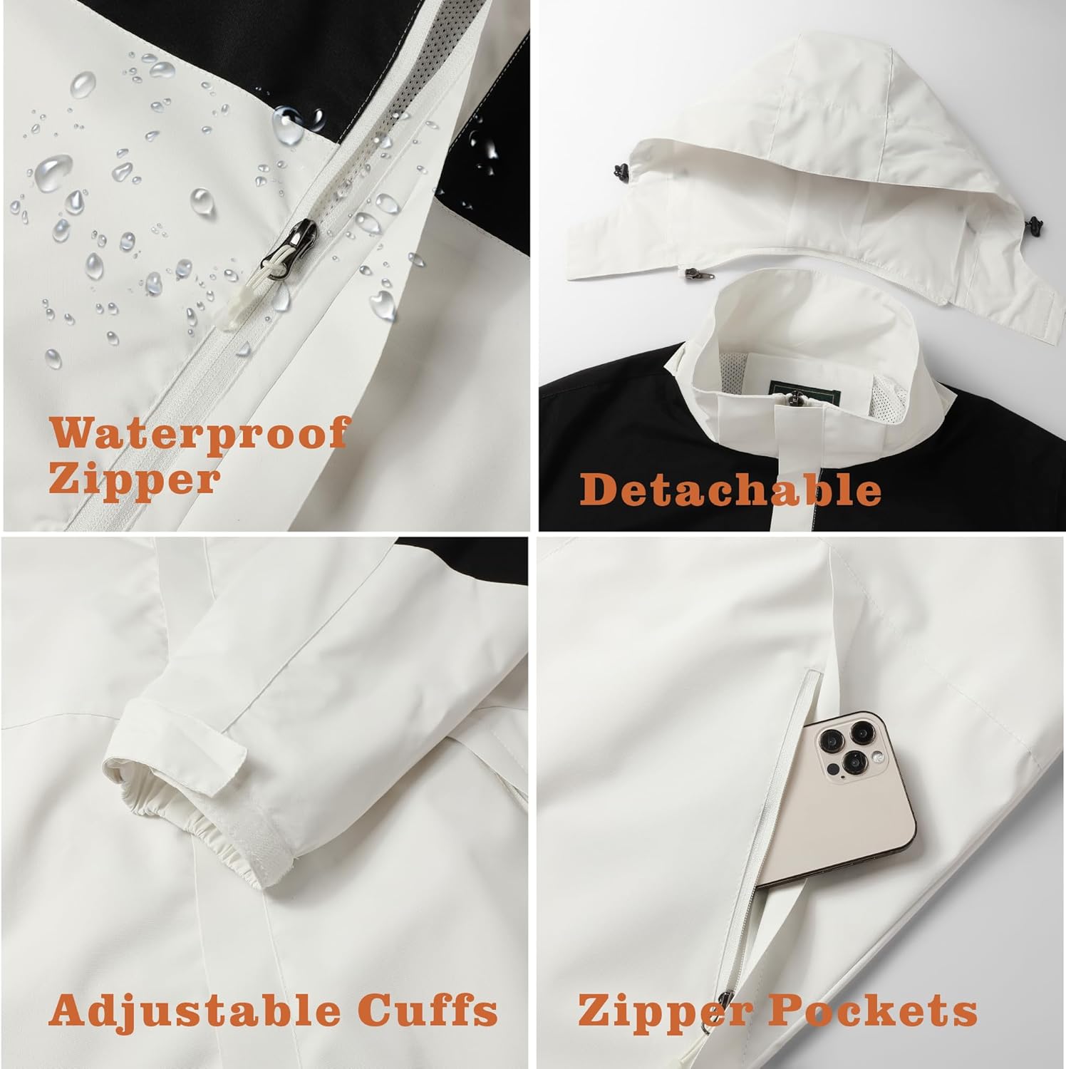 • [Adjustable Highlights]: The hood of this men's waterproof jacket hoodie is detachable and the hood has stretch straps to fit various environmental needs. Detachable hood provides different ways of wearing. The sleeves have adjustable cuffs, which can against the cold wind and make it easy to adjust the length of the sleeves.