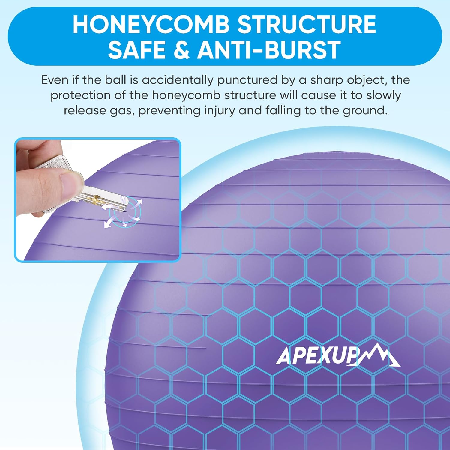 - [SAFE AND ANTI BURST] APEXUP Exercise ball is made of high-quality, eco-friendly PVC material, which meets stringent safety standards. It's non-toxic, odorless, and free from harmful heavy metals. With an anti-burst honeycomb structure, it ensures durability and safety during your workouts.