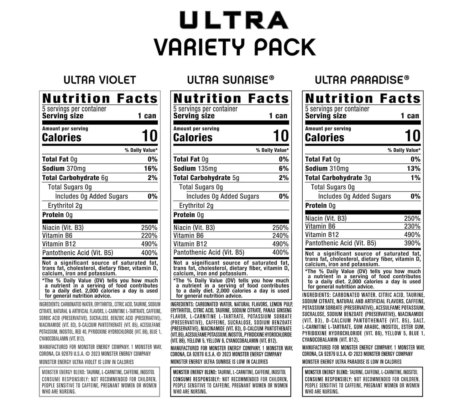 Monster Energy Ultra Variety Pack, Ultra Violet, Ultra Sunrise, Ultra Paradise, Sugar Free Energy Drink, 16 Ounce (Pack of 15)