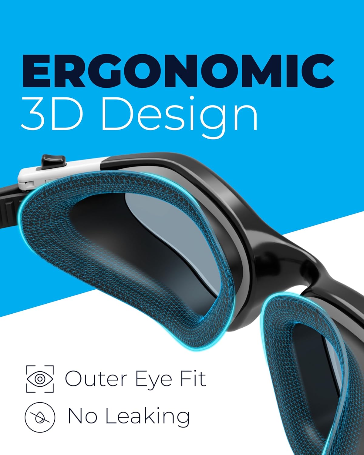 - β MORE COMFORT ~ This swim goggles offer soft & flexible silicone double seals designed to expand and contract to hug the unique contours of a swimmerβs face and achieve the right level of suction without applying excessive pressure around the eyes. In addition, the ergonomic 3D frame design ensures low water resistance and the best fit for a wide range of face shapes, men or women, adults or teenagers