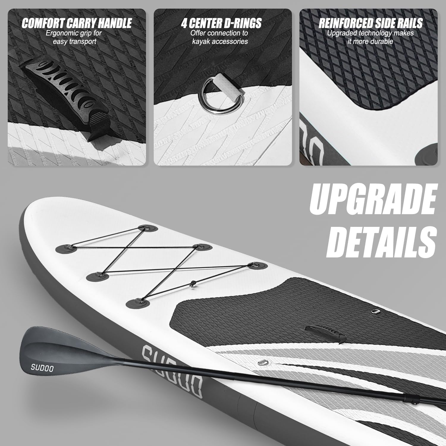 - Non-Slip Design for Better Balance: SUDOO Inflatable Stand-Up Paddleboards, 4mm cross vertical design EVA effective anti-slip reduces falls and gives you better balance when standing. 2-layer PVC exteriors with V-drop stitch core construction creates better stability and durability. Brushed thickening blow up SUP Paddle Board with non-slip soft deck, ideal for all skill levels for less accidents or injuries should you fall.