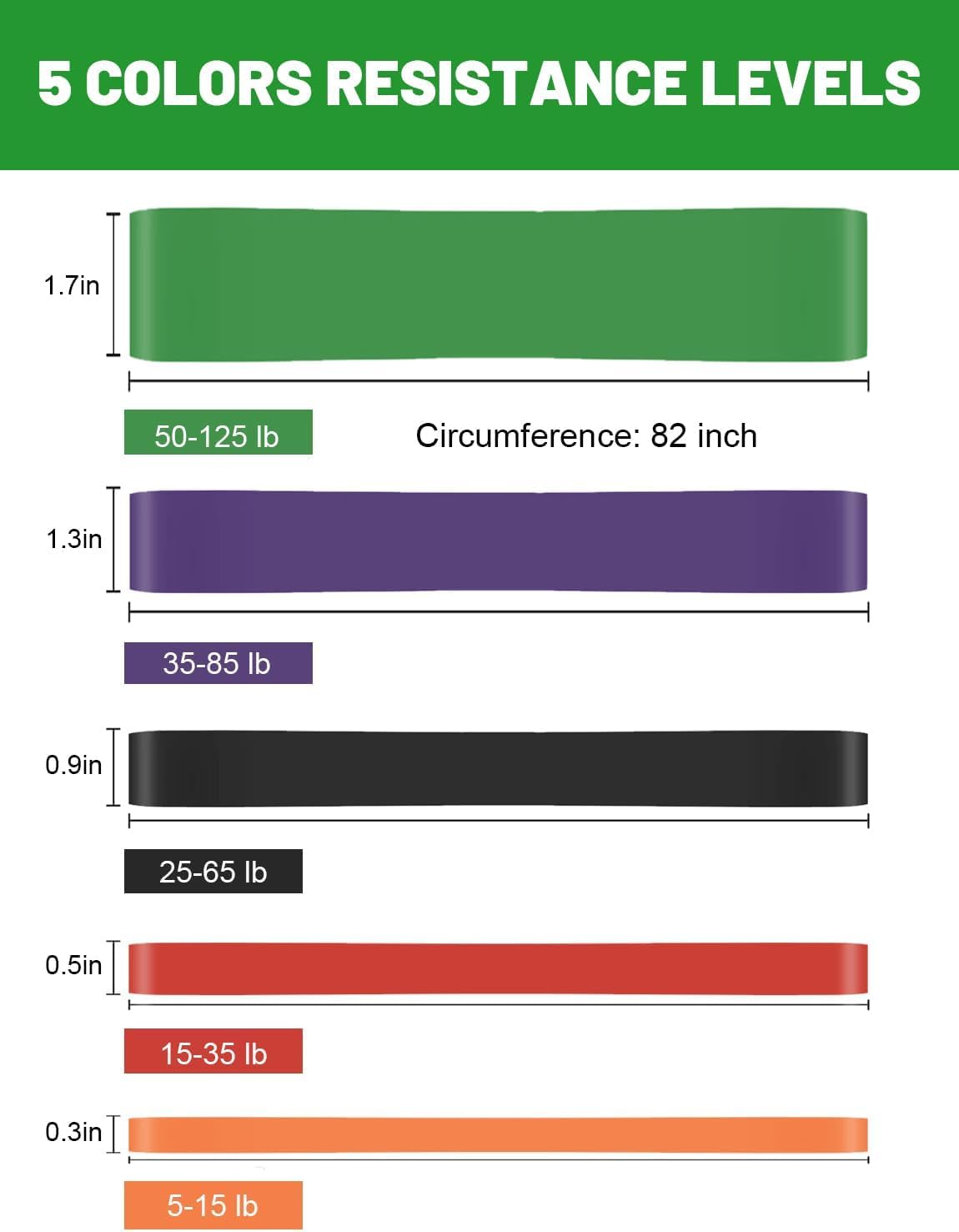 - Package Included: 5 pull up bands, 1 carrying bag and 1 workout guide. Resistance bands are Orange 5-15 lbs, Red 15-35 lbs, Black 25-65 lbs, Purple 35-85 lbs, Green 50-125 lbs. Use these exercise bands to perform rows, pulls, raises, and fly workout sets to exercise your arms, back, hips, legs, chest, and abdominal region