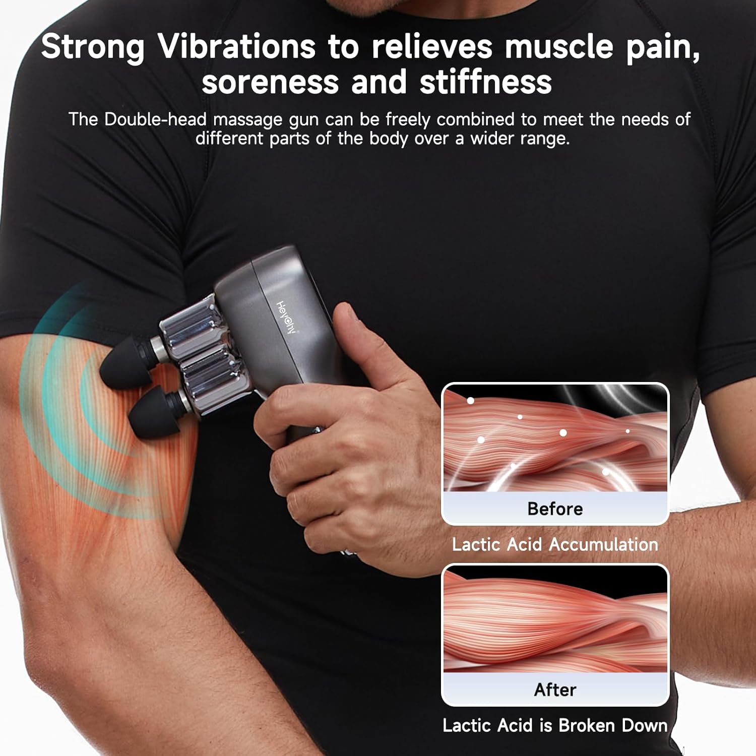 - 【Double-Head Design for Enhanced Muscle Relief】Experience double the massage power with our double-head mini massage gun, featuring two interchangeable heads for deep tissue targeting. Combine two of four specialized attachments (2×4 combinations) to address diverse muscle groups, delivering rapid pain relief and relaxation in half the time.