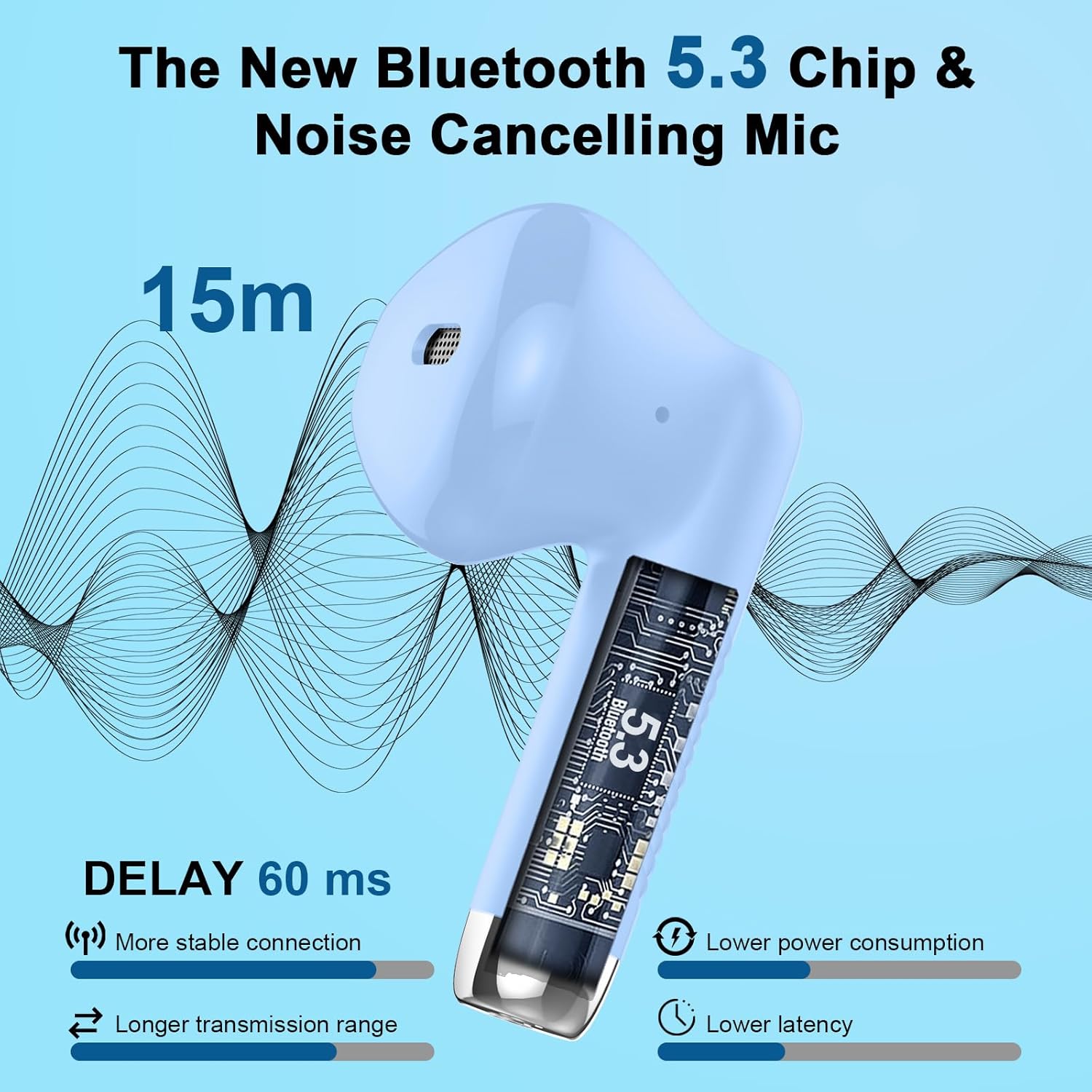 - Bluetooth 5.3, effortless pairing: the advanced Bluetooth 5.3 technology delivers a stable, low-latency wireless connection for high-quality sound(music or call). Also, the Bluetooth earbuds can connect automatically to the Bluetooth of your mobile phone when you open the charging box, avoiding complicated operations and saving waiting time.