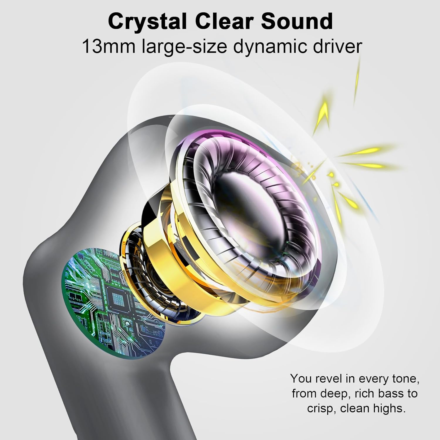 - The impressive Hi-Fi stereo sound and clear call: The wireless headphones feature 13mm drivers that boost quality sound with deep bass and mids at optimal levels that are pleasing to the ears. You will feel like an immersive concert. The built-in mic in each bluetooth earphones utilizes call noise cancellation to ensure clear and realistic sound. It will allow you to enjoy high-quality conversations anytime, anywhere.