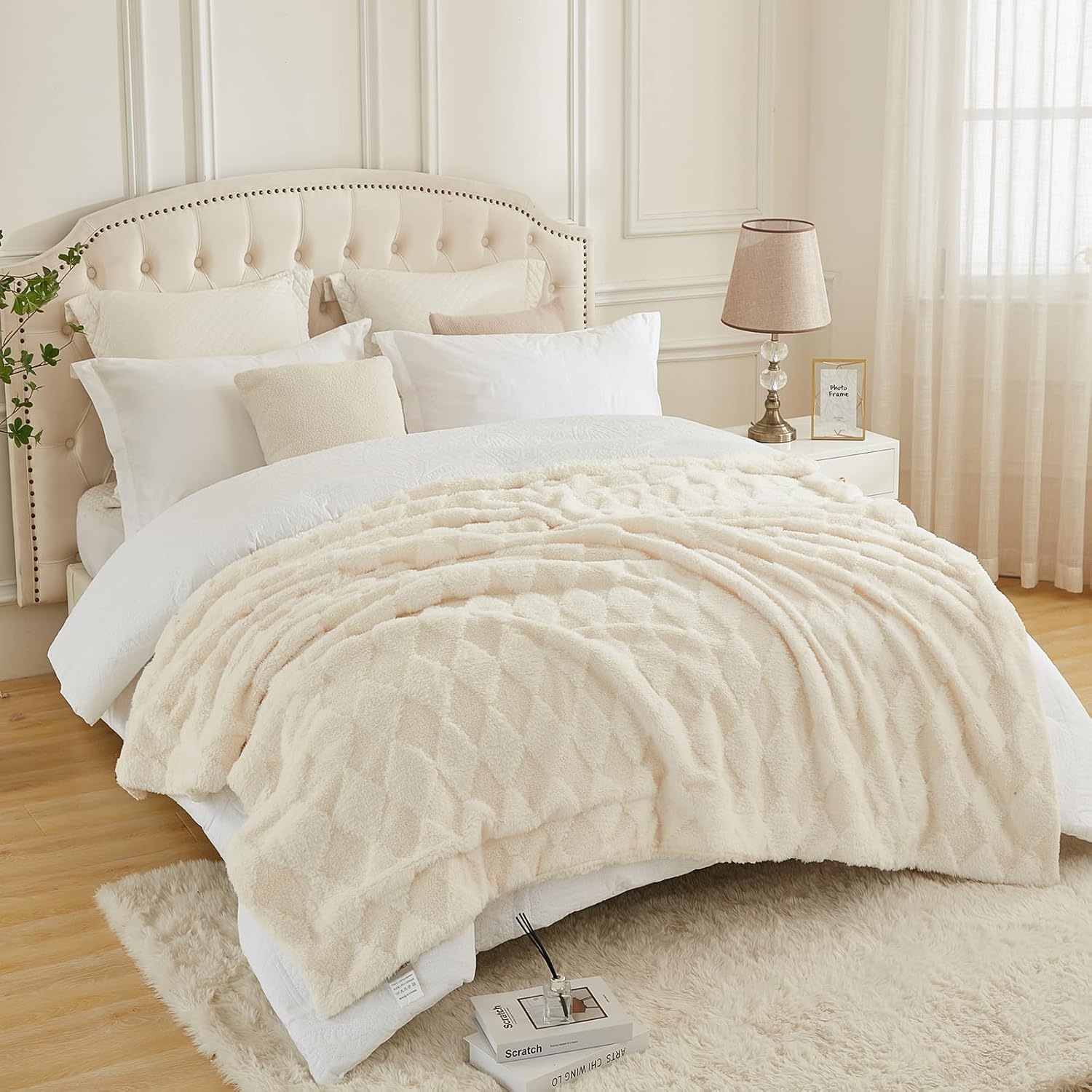 PU MEI Luxury Faux Fur Rabbit Fur Throw Blanket White 90"x80",Plush Reversible Sherpa Blankets,Queen Fuzzy Elegant Blanket Thick Throws for Bed,Washable Bedding Accent Blankets for Sofa Couch Chair