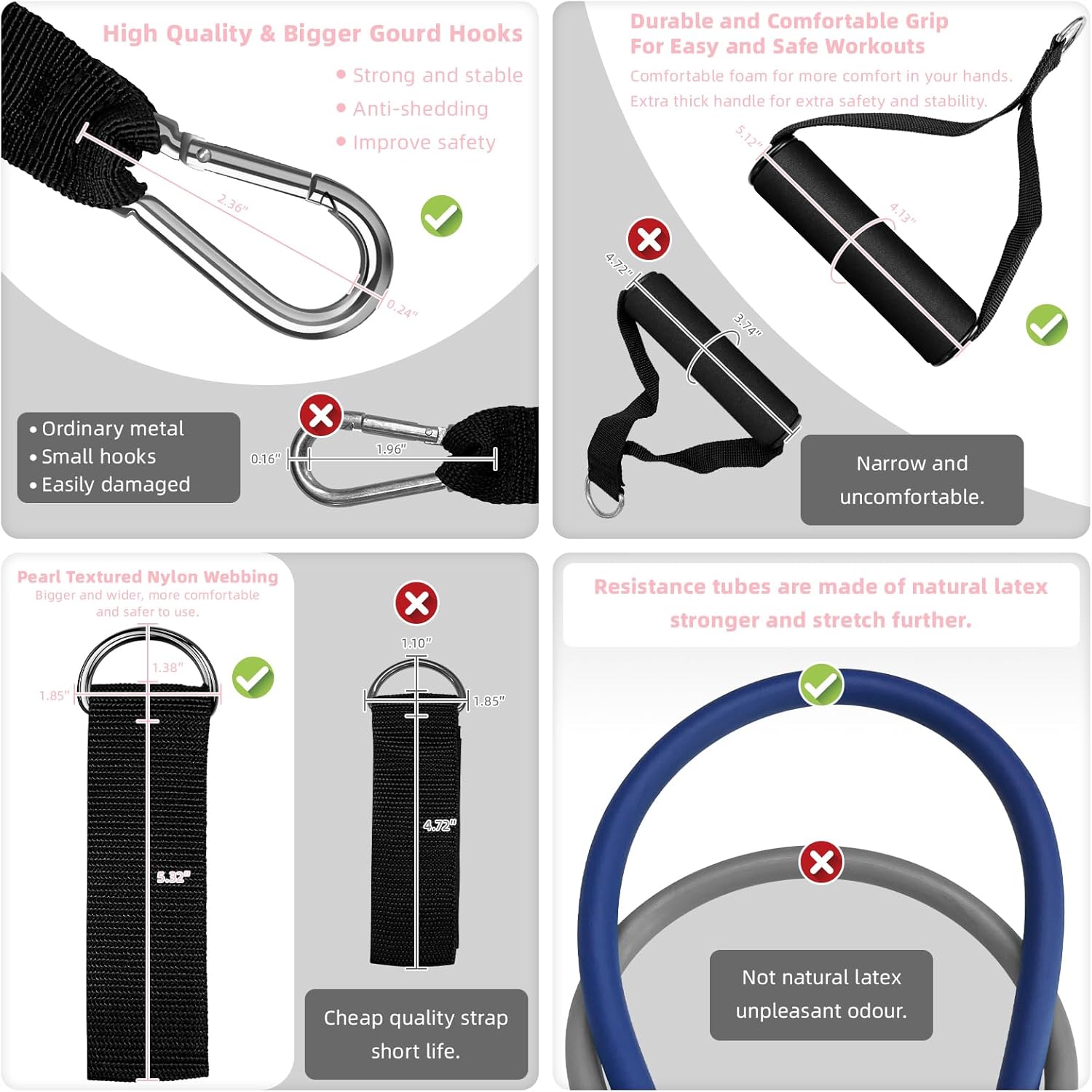 - LOAD-BEARING UPGRADE ACCESSORIES: The resistance band set includes 5 workout bands resistance, 1 door anchor, 2 cushion handles, 2 ankle straps, 1 workout guide, 1 carrying bag. The door anchor for resistance bands, the ankle straps and the resistance band handles have been enlarged and widened to achieve easier grip, greater load bearing and safer exercise environment! Besides, the foam handle is comfortable, the nylon fabric is durable and wear-resistant, and the metal hook and loop is strong